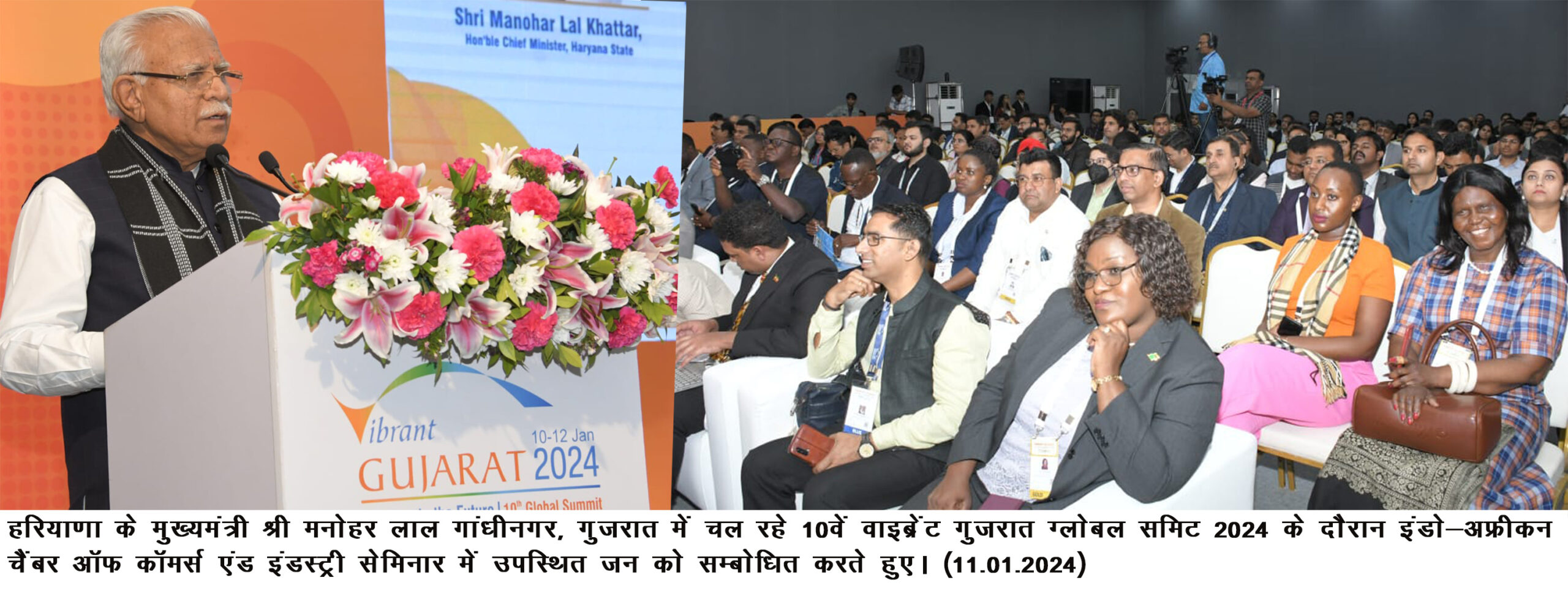चंडीगढ़। मुख्यमंत्री मनोहर लाल ने हरियाणा को संभावनाओं, क्षमताओं और समृद्धि की भूमि बताते हुए उद्यमियों को राज्य में निवेश पर विचार करने का निमंत्रण दिया। मुख्यमंत्री आज गुजरात के गांधीनगर में चल रहे 10वें वाइब्रेंट गुजरात ग्लोबल समिट 2024 के दौरान इंडो-अफ्रीकन चैंबर ऑफ कॉमर्स एंड इंडस्ट्री सेमिनार में बोल रहे थे।