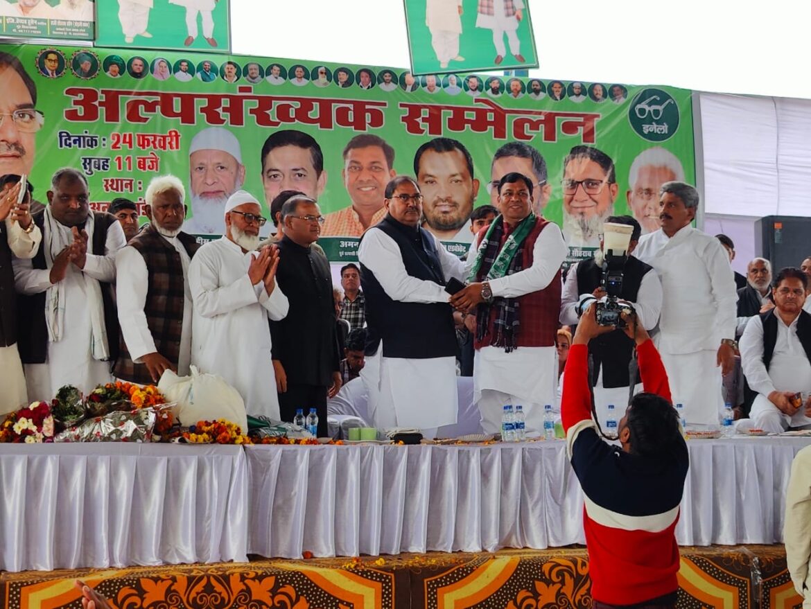 नूंह। शनिवार को नूंह की अनाज मंडी में इनेलो के अल्पसंख्यक प्रकोष्ठ का सम्मेलन किया गया। लोगों ने अभय सिंह चौटाला को पगड़ी, शाल और चांदी का मुकुट पहना कर सम्मानित किया। सम्मेलन में हजारों लोगों की भीड़ उमड़ी और सभी ने यह संकल्प लिया कि अबकी बार इनेलो को मेवात की पांचों सीटें जीता कर भेजेंगे और अभय सिंह चौटाला को प्रदेश का मुख्यमंत्री बनाएंगे। इस मौके पर जेजेपी के प्रदेश प्रधान महासचिव अमन अहमद ने जेजेपी को अलविदा कह इनेलो का दामन थामा।अभय सिंह चौटाला ने मेवात वासियों को संबोधित करते हुए कहा कि कांग्रेस ने आपके सिर्फ वोट लिए और उसके बाद सत्ता में आने के बाद मेवात की पूरी तरह से अनदेखी की और सिर्फ प्रदेश को लूटा। अब भी कांग्रेस के मेवात से तीन विधायक हैं लेकिन किसी एक भी विधायक ने आपकी आवाज जनता के सामने और विधानसभा में नहीं उठाई। उसके बाद अब बीजेपी की सरकार ने तो मेवात को तबाह करने की साजिशें रची। पूरे देश और प्रदेश के हमारे सामाजिक ताने-बाने को तोड़ने के लिए बीजेपी ने धर्म और मजहब की राजनीति करके आपसी भाईचारे को तोड़ने और माहौल बिगाड़ने की कोशिश की। लेकिन मेवात के लोग बधाई के पात्र हैं कि उन्होंने आपसी भाईचारे को कायम रखा और बीजेपी और आरएसएस के लोगों को सबक सिखाने का काम किया। मैने विधानसभा में खुलकर कहा था कि मेवात में दंगों को भडक़ाने की साजिश किसी और की नहीं बल्कि बीजेपी और आरएसएस की थी। कांग्रेस और बीजेपी के नेता सिर्फ मेवात के लोगों के वोट लेने के लिए आते हैं लेकिन विकास खुद का करते हैं।