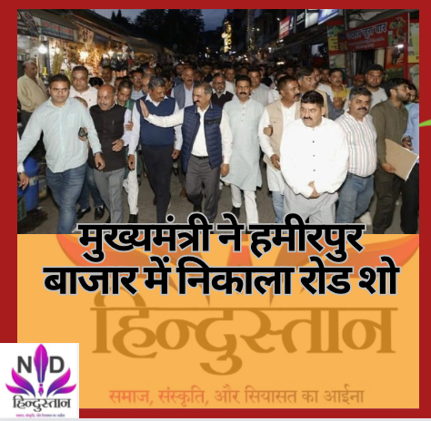 शिमला। मुख्यमंत्री ठाकुर सुखविंदर सिंह सुक्खू ने बुधवार शाम हमीरपुर बाजार में रोड शो निकाला। रोड शो की शुरूआत गांधी चौक से हुई और समापन भोटा चौक पर हुआ। मुख्यमंत्री ने गांधी चौक पर राष्ट्रपिता महात्मा गांधी की प्रतिमा पर माल्यार्पण किया। कांग्रेस नेताओं ने गांधी चौक पहुंचने पर फूलमालाओं से स्वागत किया। शॉल व टोपी से मुख्यमंत्री को सम्मानित किया गया। कांग्रेस कार्यकर्ताओं ने जोरदार नारेबाजी की। मुख्यमंत्री का बाजार में जगह-जगह स्वागत हुआ। ठाकुर सुखविंदर सिंह रोड शो के दौरान बाजार में व्यवसायियों से मिले।