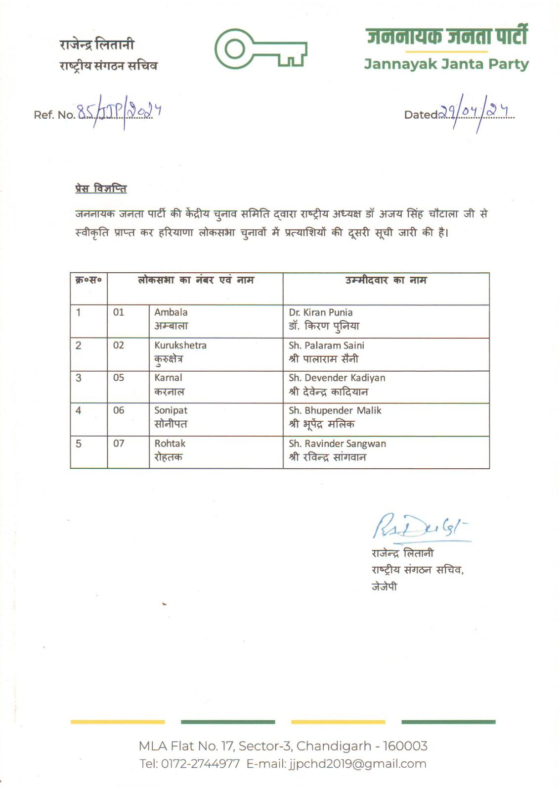 जेजेपी की दूसरी लिस्ट जारी, बचे पांच लोकसभा उम्मीदवारों का ऐलान