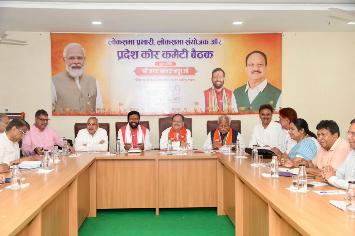 बैठक में राष्ट्रीय उपाध्यक्ष सौदान सिंह, हरियाणा के मुख्यमंत्री नायब सैनी, पूर्व मुख्यमंत्री मनोहर लाल, भाजपा के राष्ट्रीय सचिव ओम प्रकाश धनखड़, लोकसभा चुनाव प्रभारी सतीश पूनिया, चुनाव सह प्रभारी सुरेन्द्र नागर, लोकसभा चुनाव प्रबंधन समिति के संयोजक एवं राज्यसभा सांसद सुभाष बराला, डा. सुधा यादव, संगठन मंत्री फणीन्द्रनाथ शर्मा आदि समेत लोकसभा प्रभारी, लोकसभा संयोजक, समन्वयक, कलस्टर इंचार्ज मौजूद रहे। हरियाणा की 10 की 10 सीटों को प्रचंड बहुमत से जीतने के लिए भाजपा आगामी दिनों में चुनाव प्रचार और तेज करने वाली है। प्रधानमंत्री नरेंद्र मोदी, केंद्रीय गृहमंत्री अमित शाह, रक्षा मंत्री राजनाथ सिंह जैसे बड़े नेताओं की एंट्री अब हरियाणा में होगी। जेपी नड्डा की अध्यक्षता में आज हुई बैठक में पीएम मोदी और अमित शाह की रैलियों का रोडमैप तैयार किया और प्रदेश के वर्तमान राजनीतिक हालातों पर भी चर्चा हुई। कोर कमेटी की इस बैठक में हर वोटर तक पहुंचने और मतदाताओं को भाजपा के पक्ष में मतदान करने की रणनीति पर मंथन हुआ।