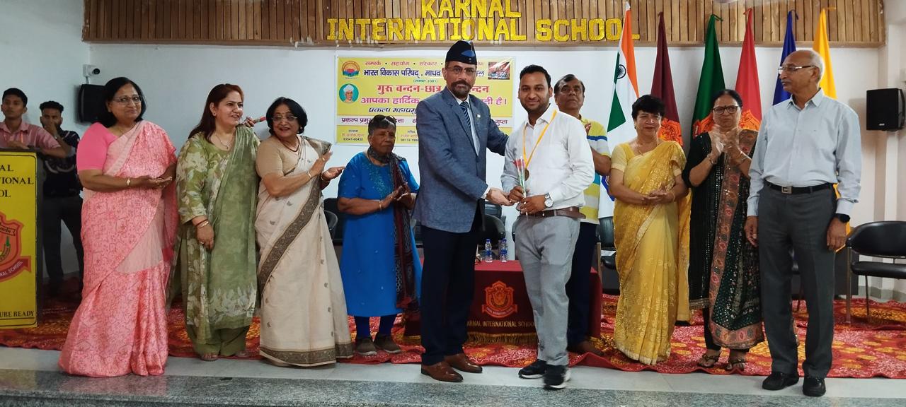करनाल। करनाल इन्टरनेशनल स्कूल में आयोजित हुआ गुरु वंदन छात्र अभिनंदन समारोह में मेधावी विद्यार्थियों का अभिनंदन एवं सम्मान किया गया। भारत विकास परिषद माधव शाखा करनाल द्वारा आयोजित इस कार्यक्रम में सीबीएसई दसवीं कक्षा के परीक्षा परिणाम घोषित होने पर गुरु वंदन छात्र अभिनंदन समारोह में परिषद माधव शाखा के अध्यक्ष राजेंद्र चिकारा, परिषदकी प्रांतीय बाल संस्कार शिविर संयोजिका डाक्टर सुचेता गुप्ता के निर्देशन में आर्य शाखा के प्रोजेक्ट निर्देशक गौरी दत्ता, प्रोफेसरसुजाता गुप्ता, सचिव भी राजेश भाटिया, कोषाध्यक्ष अनिल गिरधर, प्रोफेसर पायल चौधरी, डाक्टर वीके चौधरी, लीला चिकाराऔर शशि गर्ग का स्कूल के चेयरमैन अरुण दत्ता और प्राचार्य गरिमा शर्मा ने स्वागत और सम्मान किया गया। इम अवसर पर परिषद के सदस्यों के स्वागत में स्कूल के विद्यार्थियों ने देशभक्ति और भारतीय संस्कृति से ओतप्रोत प्रस्तुतियां डा. विक्रम साराभाई सभागार में दी।