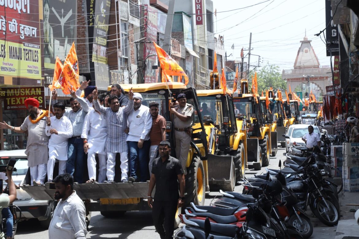 200 से ज्यादा बुलडोजरों पर भगवा झंडा लहराकर स्वागत में निकले भाजपा के कार्यकर्ता।