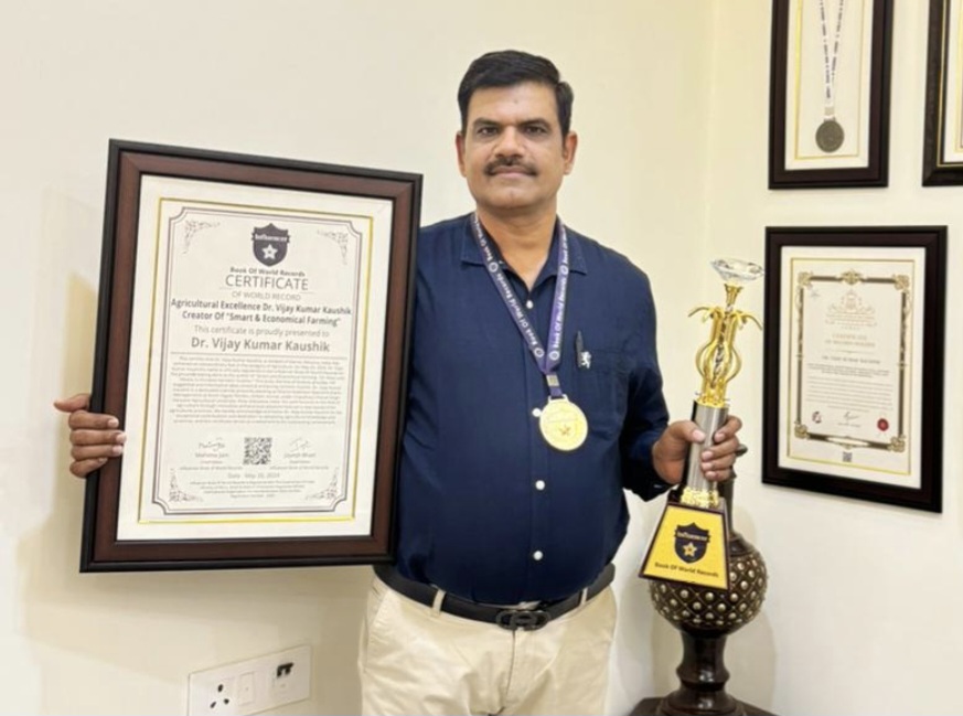 करनाल।हरियाणा कृषि विश्वविद्यालय हिसार के कृषि विज्ञान केंद्र करनाल में कार्यरत वैज्ञानिक डॉ. विजय कौशिक ने चौथा वर्ल्ड रिकॉर्ड बनाया है। उनको यह वर्ल्ड रिकॉर्ड स्मार्ट एंड इकोनॉमिकल फार्मिंग नामक पुस्तक की रचना के लिए मिला है जिसमें उन्होंने किसानों की आय बढ़ाने के लिए 101 तरीक़े सुझाए है। इन सुझावों में फ़सल सुधार, कृषि उत्पाद की मार्केटिंग, सरकार के द्वारा चलाई जा रही योजनाओं के लाभ आदि को विस्तार से समझाया गया है। डॉ कौशिक ने यह पुस्तक 2023 में तैयार की थी। पुस्तक की सॉफ्ट कॉपी के आधार पर इंफ्ल्यूएंसर बुक ऑफ़ वर्ल्ड रिकॉर्ड ने डॉ. कौशिक को वर्ल्ड रिकॉर्ड से नवाजा है। पुस्तक अभी पब्लिश होनी है। उनका पहला वर्ल्ड रिकॉर्ड 2021 में भारत रत्न अवार्डीज़ पर प्रथम काव्य संग्रह लिख कर अपना नाम वर्ल्ड बुक ऑफ़ रिकॉर्ड्स, लंदन में नाम दर्ज कराया, दूसरा वर्ल्ड रिकॉर्ड सामाजिक कुरीतियों, रीति रिवाजों एवम् त्यौहारों पर प्रथम काव्य संग्रह लिखकर हॉर्वर्ड वर्ल्ड रिकॉर्ड्स लंदन तथा तीसरा वर्ल्ड रिकॉर्ड कृषि आधारित 31 खाद्यान्न, दलहन, तिलहन तथा चारा फसलों पर काव्य संग्रह तैयार कर ब्रावो इंटरनेशनल बुक ऑफ़ वर्ल्ड रिकॉर्ड्स, यूनाइटेड अरब अमीरात प्राप्त किया।