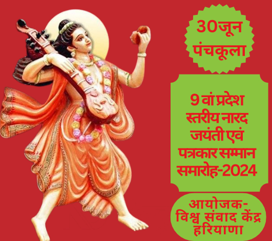 चंडीगढ़।पंचकूला में 30 जून को विश्व संवाद केंद्र द्वारा आयोजित 9 वें देवर्षि नारद जयंती एवं राज्य स्तरीयपत्रकार सम्मान समारोह के मुख्य अतिथि हरियाणा के मुख्यमंत्री नायब सिंह सैनी होंगे। इस कार्यक्रम में मुख्य वक्ता के रुप में  राष्ट्रीय स्वयंसेवक संघ के अखिल भारतीय प्रचार प्रमुख सुनील आंबेकर,एवं विशिष्ट अतिथि प्रख्यात समाजसेवी संतराम शर्मा (व्हाइट हाऊस पिंजौर) एवं विशेष अतिथि के रुप में एबीपी न्यूज चैनल के एंकर श्रीवर्धन त्रिवेदी एवं  सम्मानित अतिथि के रुप में प्रसिद्ध उद्योगपति गोपाल तायल की उपस्थिति रहेगी। यह जानकारी विश्व संवाद केंद्र के सचिव राजेश कुमार ने दी।