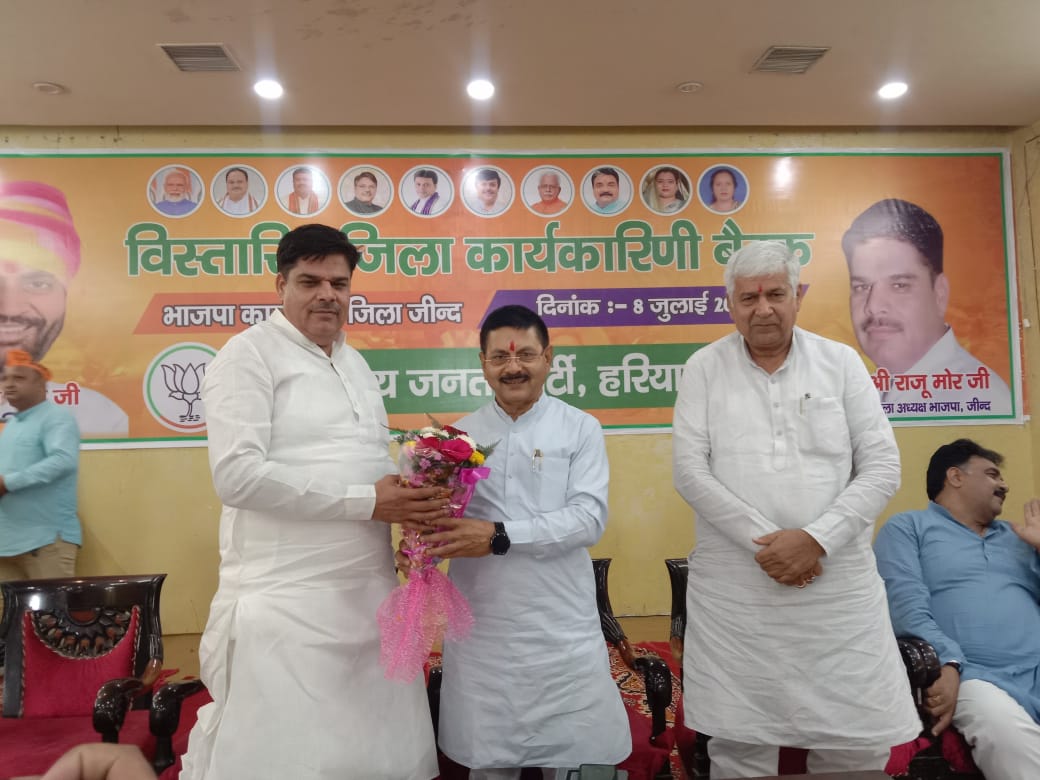 चंडीगढ़/जींद, 8 जुलाई। भारतीय जनता पार्टी की जींद जिला की विस्तारित जिला कार्यकारिणी की बैठक भाजपा जिला कार्यालय में जिला अध्यक्ष राजू मोर की अध्यक्षता में हुई। बैठक में संगठन महामंत्री फणीन्द्रनाथ शर्मा मुख्य रूप से मौजूद रहे। बैठक में संगठन से संबंधित गतिविधियों की समीक्षा के साथ-साथ आने वाले दिनों में आयोजित होने वाले कार्यक्रमों पर चर्चा की गई। वरिष्ठ नेता विजयपाल एडवोकेट ने कार्यकारिणी में राजनीतिक प्रस्ताव पेश किया जिसका पूर्व विधायक कलिराम पटवारी ने अनुमोदन किया। कार्यकारिणी को संगठन मंत्री और विधायक डा. कृष्ण मिड्ढा ने भी संबोधित किया। कार्यकारिणी में केंद्र में तीसरी बार मोदी सरकार बनने पर देश और प्रदेश की जनता का आभार जताया।
