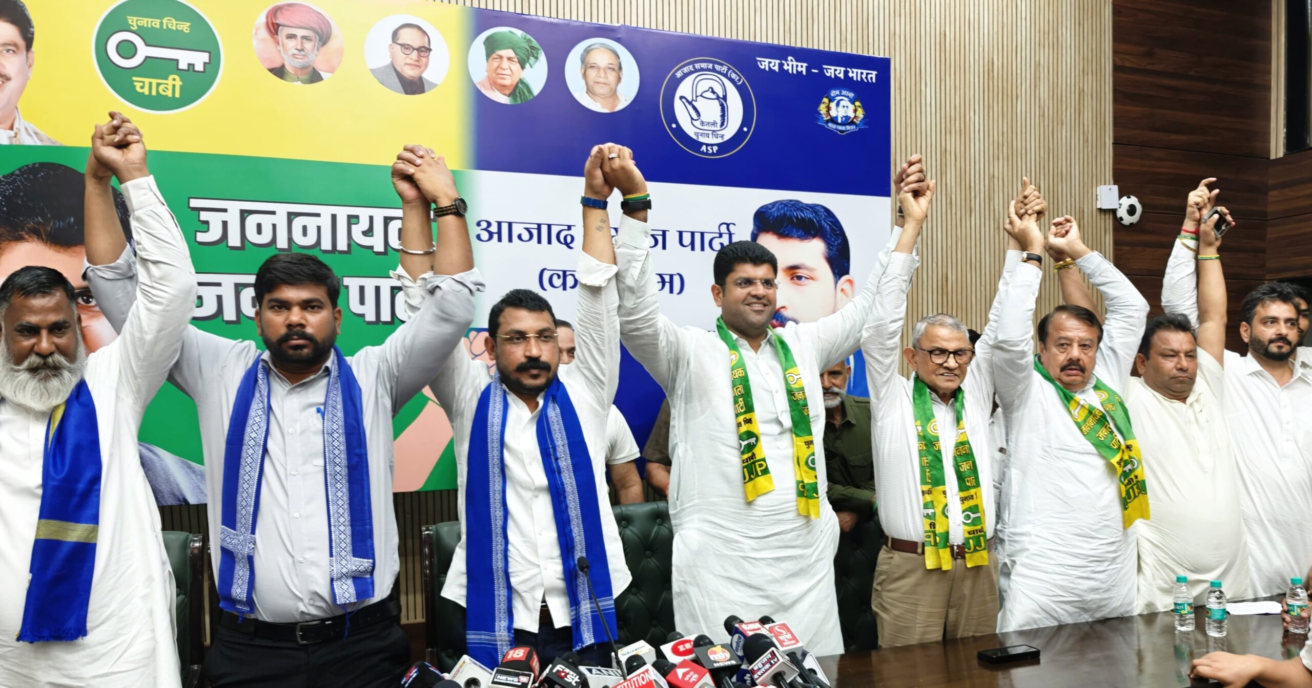 नई दिल्ली/चंडीगढ़। हरियाणा की राजनीति में एक नया मोड़ आ गया है। जननायक जनता पार्टी और आजाद समाज पार्टी (कांशीराम) मिलकर विधानसभा चुनाव लड़ेगी। दोनों पार्टियों में टिकट को लेकर भी बटंवारा हो गया है। जेजेपी 70 और एएसपी 20 सीटों पर चुनाव लड़ेगी। मंगलवार को इसकी घोषणा दिल्ली में आयोजित जेजेपी और एएसपी की संयुक्त प्रेस कॉन्फ्रेंस के दौरान हरियाणा के पूर्व डिप्टी सीएम दुष्यंत चौटाला और एसएसपी प्रमुख एवं सांसद चंद्रशेखर आजाद ने की। दोनों युवा दुष्यंत चौटाला और चंद्रशेखर आजाद ने कहा कि यह गठबंधन हरियाणा को मजबूती से आगे लेकर जाएगा। उन्होंने कहा कि दोनों मिलकर गरीब, किसान, कमेरे वर्ग की लड़ाई को लड़ेंगे और जननायक चौधरी देवीलाल व मान्यवर कांशीराम के सपनों को साकार करेंगे।