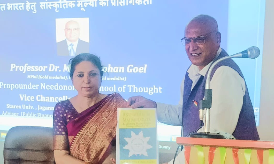 कुरूक्षेत्र। “विकास को केवल आर्थिक प्रगति से नहीं मापा जा सकता है, बल्कि यह उन मूल्यों, परंपराओं और दर्शन में गहराई से निहित होना चाहिए जो भारत के लोकाचार को आकार देते हैं।“ये शब्द तीन बार कुलपति, जिसमें राजीव गांधी राष्ट्रीय युवा विकास संस्थान (आरजीएनआईवाईडी श्रीपेरंबदूर) -राष्ट्रीय महत्व का संस्थान , एवं नीडोनोमिक्स स्कूल ऑफ थॉट के प्रवर्तक कुरूक्षेत्र विश्वविद्यालय से सेवानिवृत्त अर्थशास्त्र के प्रोफेसर डॉ. मदन मोहन गोयल ने कहे । कुरुक्षेत्र विश्वविद्यालय के हिंदी विभाग द्वारा आयोजित “विकसित भारत हेतु सांस्कृतिक मूल्यों की प्रासंगिकता” पर एक विस्तार व्याख्यान देते हुए, प्रो. एम. एम गोयल ने इस बात पर जोर दिया कि विविधता, आध्यात्मिकता और नैतिक सिद्धांतों से समृद्ध भारतीय संस्कृति एक समृद्ध और टिकाऊ विकसित भारत हेतु आवश्यक है।. कला एवं भाषा संकाय की डीन एवं अध्यक्ष प्रो. पुष्पा रानी ने ने स्वागत भाषण दिया और प्रो. एम.एम.गोयल की उपलब्धियों के सम्मान में एक प्रशस्ति पत्र प्रस्तुत किया।
