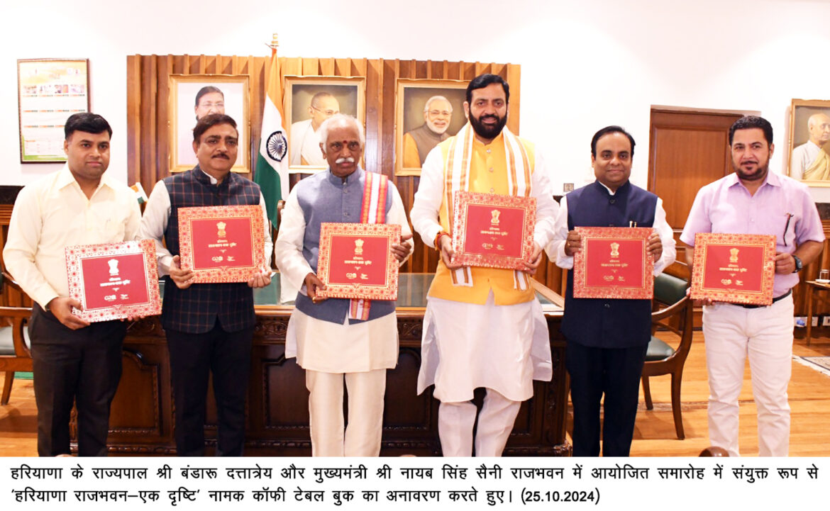 चण्डीगढ़। हरियाणा के राज्यपाल श्री बंडारू दत्तात्रेय और मुख्यमंत्री श्री नायब सिंह सैनी ने आज राजभवन में आयोजित एक भव्य समारोह में संयुक्त रूप से ‘हरियाणा राजभवन-एक दृष्टि’ नामक कॉफी टेबल बुक का अनावरण किया।