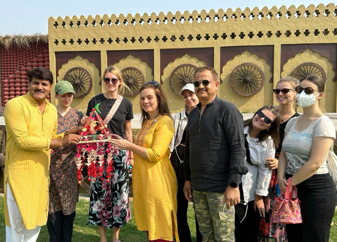 कुरुक्षेत्र । हरियाणवी कल्चर एण्ड हैंडमेड फुलझड़ी इज दि यूनिक क्राफ्ट ऑफ हरियाणा, हरियाणा हैव इट्स रिच कल्चर एण्ड हेरिटेज ये शब्द जर्मनी डेलिगेशन की प्रतिनिधि एंजिलिका हॉफ ने विरासत दि हेरिटेज विलेज के अवलोकन के पश्चात कहे। हरियाणा में जर्मनी का डेलिगेशन कल्चरल एक्सचेंज प्रोग्राम के तहत हरियाणा के सांस्कृतिक स्थलों के अवलोकन के लिए विरासत में पहुंचा। यह जानकारी विरासत के संयोजक डॉ. महासिंह पूनिया ने दी। उन्होंने बताया कि टीडीआई स्कूल कुंडली के प्राचार्य डॉ. हरेन्द्र शर्मा के नेतृत्व में जर्मनी के 10 शिक्षकों का प्रतिनिधिमंडल विरासत में पहुंचा। इस अवसर पर विरासत की ओर से प्रतिनिधिमंडल का लोक पारंपरिक तरीके से स्वागत किया गया। प्रतिनिधिमंडल ने हरियाणा के परिवहन के साधनों का अवलोकन किया। इसके साथ ही सभी ने दादा खेड़े की धोक मारकर पूजा अर्चना कर हरियाणवी संस्कृति के प्रति अपना प्रेम अभिव्यक्त किया। इस मौके पर विरासत की ओर से अभिनव पूनिया एवं डॉ. महाङ्क्षसह पूनिया ने हरियाणवी संस्कृति के विविध पहलुओं से जुड़ी हुई जानकारी प्रतिनिधिमंडल को दी। उन्होंने हरियाणा की पुरातन वस्तुओं का अवलोकन किया। साथ ही विरासत के मुख्य गेट पर लगे सौ साल से अधिक पुराने दरवाजे को देखकर जर्मनी वासी अभिभूत हो उठे। इस अवसर पर मंयंक शर्मा ने उन्हें विरासत के भावी योजनाओं एवं सांस्कृतिक पहलुओं पर विस्तार से जानकारी प्रदान की। इस अवसर पर विरासत की ओर से प्रतिनिधिमंडल की मुखिया एंजिलिका हॉफ को हाथ से बनी हुई फुलझड़ी उपहार के रूप में भेंट की। हाथ से बनी फुलझड़ी को देखकर मैडम हॉफ और प्रतिनिधिमंडल के सभी सदस्य अभिभूत हो उठे। इस मौके पर जर्मनी के प्रतिनिधिमंडल ने मैडम लियोनी मास, सबरीना, सलीना, लौरा, एनेलिया, माहिम सहित अनेक सदस्यों ने विरासत का अवलोकन किया।