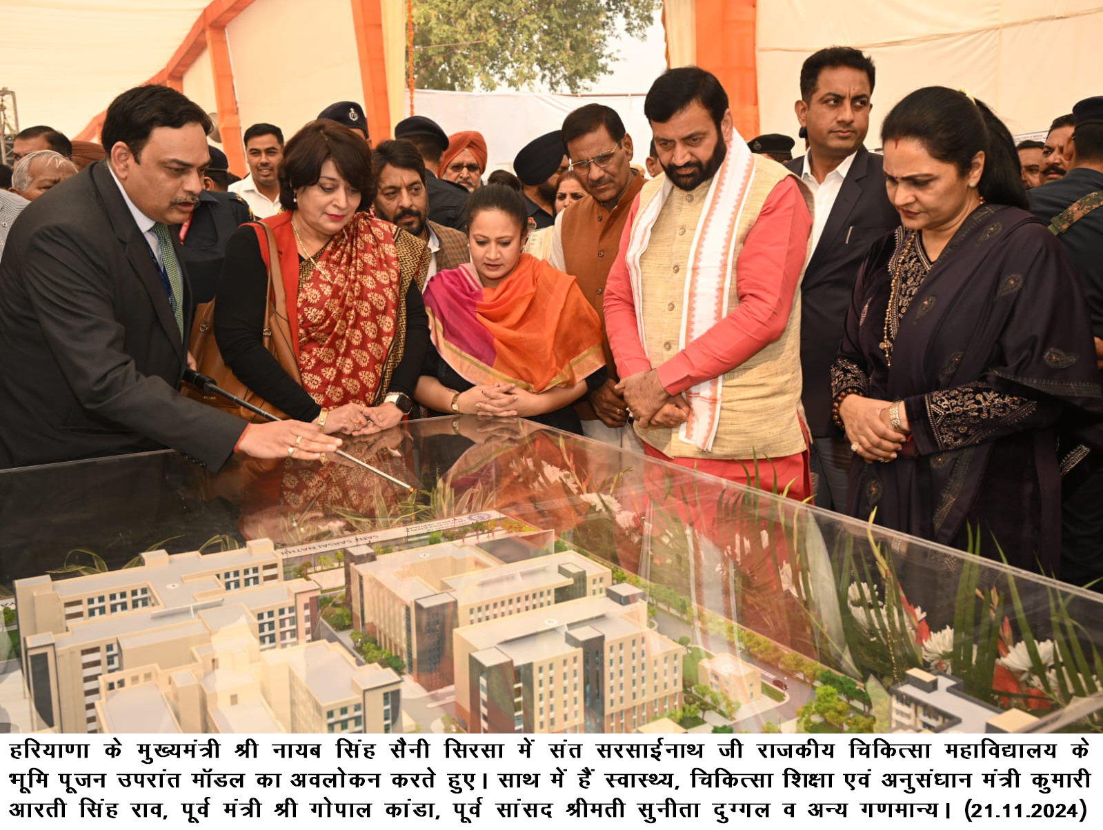 हरियाणा की स्वास्थ्य मंत्री कुमारी आरती सिंह राव ने कहा कि सिरसा में मेडिकल कॉलेज की जरूरत भी थी और सिरसा के लोगों की पुरानी मांग भी, जिसे आज मुख्यमंत्री नायब सिंह सैनी ने भूमि पूजन कर पूरा किया है। इस मेडिकल कॉलेज में 540 बेड की व्यवस्था होगी और युवाओं के लिए एमबीबीएस की 100 सीटें उपलब्ध होंगी।