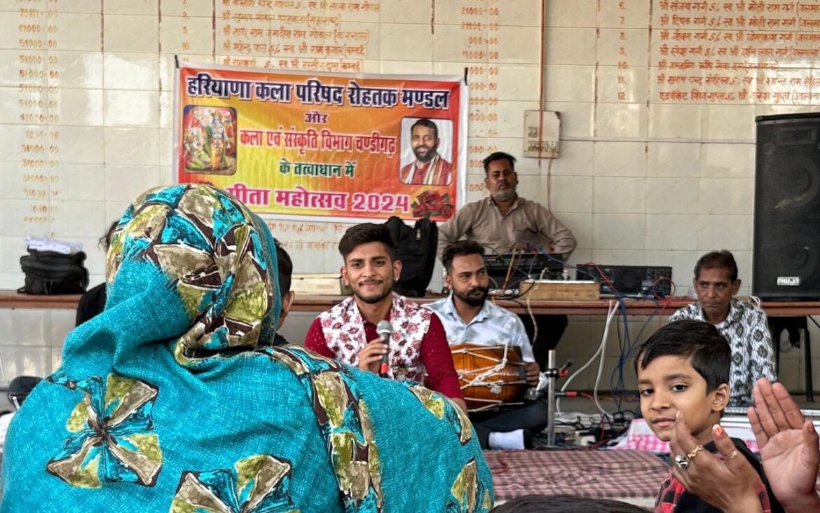 करनाल । हरियाणा कला परिषद, रोहतक मंडल के अतिरिक्त निदेशक व मुख्यमंत्री के ओएसडी गजेंद्र फोगाट ने बताया कि अंतरराष्ट्रीय गीता जयंती महोत्सव 28 नवंबर से शुरू हो चुका है। अंतरराष्ट्रीय गीता महोत्सव के अंतर्गत 48 कोस तीर्थ पर सांस्कृतिक कार्यक्रमों का आयोजन किया जा रहा है। इसी कड़ी में गत दिवस विमल सर तीर्थ सग्गा, आहन तीर्थ निगदू, दशरथ तीर्थ औगंद, मिश्रक तीर्थ निसिंग, दक्षेश्वर तीर्थ डाचर, गवेंदर तीर्थ गोंदर, जमदग्रि कुंड जलमाना, त्रिगुणानंद तीर्थ गुनियाना, वेदवती तीर्थ सीतामाई, ब्रह्म तीर्थ सावंत, आरोग्य तीर्थ बरास तथा दुंडीराज तीर्थ सौंकड़ा पर हरियाणा कला परिषद रोहतक मंडल और कला एवं सांस्कृतिक विभाग हरियाणा के संयुक्त तत्वावधान में सांस्कृतिक कार्यक्रम का आयोजन किया गया। इन कार्यक्रमों में गगन एण्ड पार्टी, अभिषेक एंड पार्टी, भगतराम एंड पार्टी, सुनील एंड पार्टी, जयपाल एंड पार्टी, विशेष भंडेरी एंड पार्टी, पाले राम एंड पार्टी, रामचंद्र एंड पार्टी, गौरव एंड पार्टी व विशाल एंड पार्टी ने धार्मिक प्रस्तुतियां दी, जिसे देख लोग मंत्रमुग्ध हो गए।