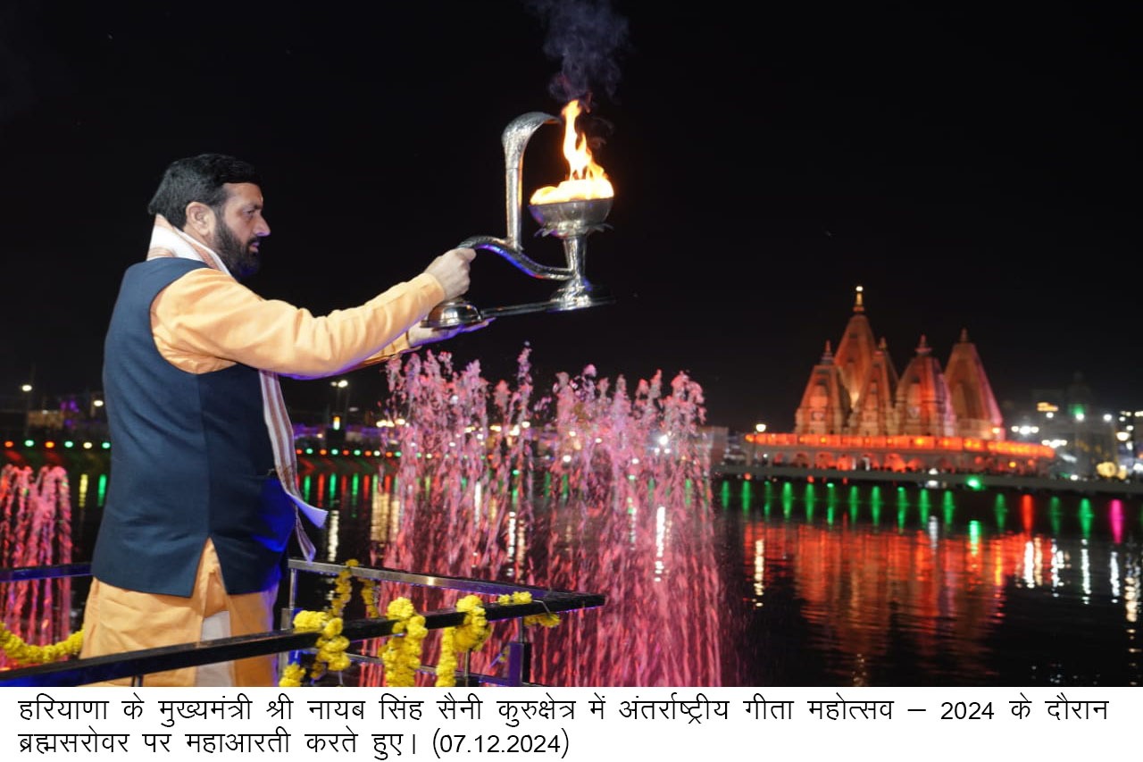 हरियाणा के मुख्यमंत्री श्री नायब सिंह सैनी ने कहा कि भगवान श्रीकृष्ण ने कुरुक्षेत्र की पावन धरा से पूरे विश्व को गीता का उपदेश दिया। यह उपदेश आज भी पूरे विश्व के लिए प्रासंगिक है। इसलिए कुरुक्षेत्र का महत्व पूरे विश्व में है। इस पावन धरा पर हर वर्ष कुरुक्षेत्र विकास बोर्ड की तरफ से अंतरराष्ट्रीय गीता महोत्सव और सभी संस्थाओं की ओर से गीता महोत्सव को परम्परागत और हर्षोल्लास के साथ मनाया जाता है। सांध्यकालीन महाआरती का हिस्सा