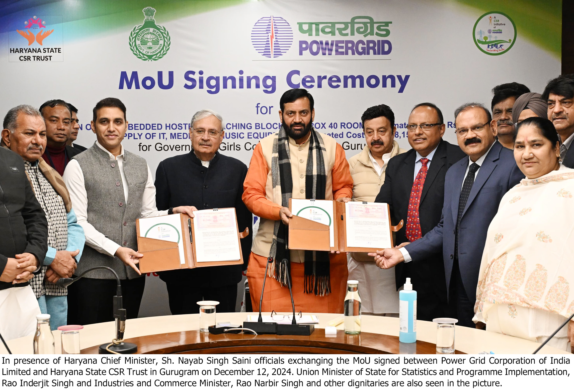 चंडीगढ़ । हरियाणा के मुख्यमंत्री श्री नायब सिंह सैनी की उपस्थिति में आज गुरुग्राम में पॉवरग्रिड और जिला प्रशासन के बीच एक समझौता ज्ञापन (एमओयू) साइन किया गया। इस एमओयू के तहत गुरुग्राम के सेक्टर 14 स्थित राजकीय कन्या महाविद्यालय में ढांचागत तंत्र को विकसित करने के लिए पॉवरग्रिड द्वारा कॉरपोरेट सामाजिक दायित्व (सीएसआर) स्कीम के अंतर्गत करीब 20 करोड़ से अधिक रुपये के विकास कार्य कराए जाएंगे। जिला प्रशासन की तरफ से जिला उपायुक्त अजय कुमार और पॉवरग्रिड की ओर से महाप्रबंधक अशोक कुमार मिश्रा ने एमओयू पर हस्ताक्षर किए।