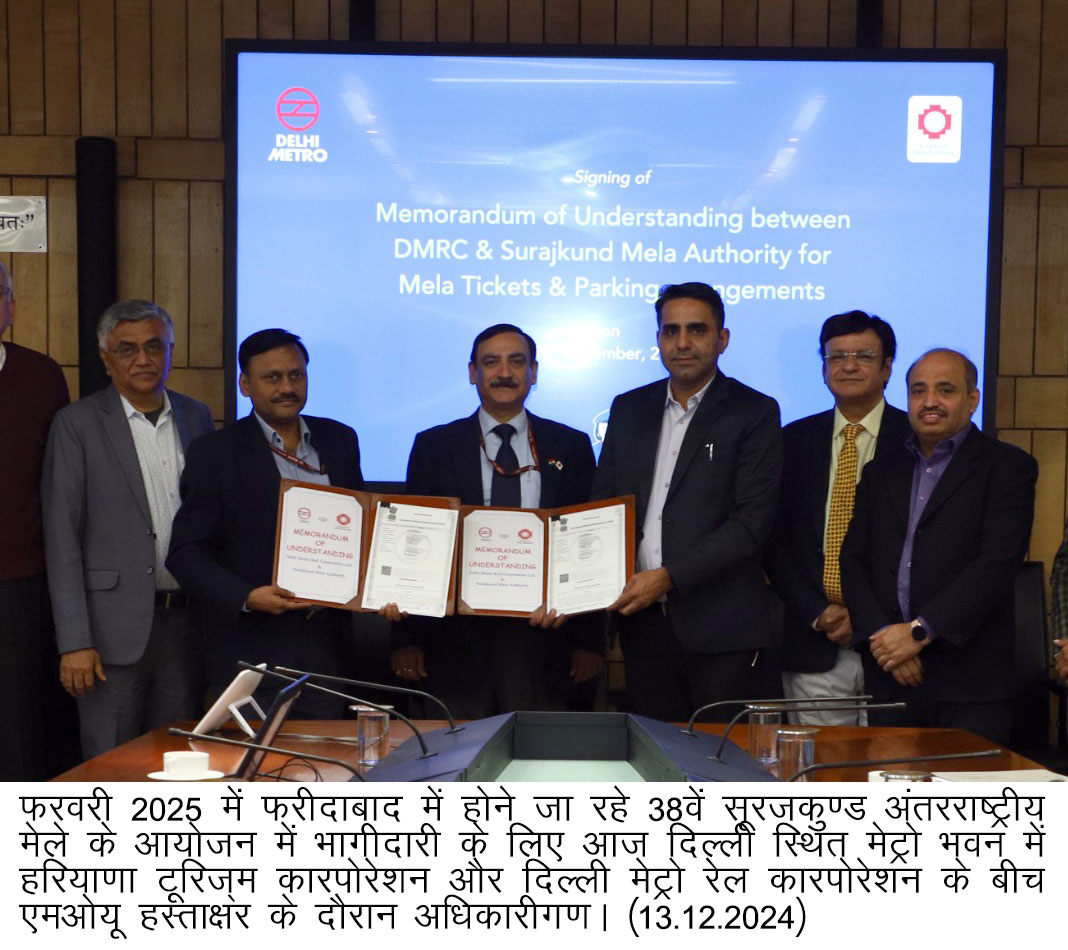 चंडीगढ़ । हरियाणा टूरिज्म कॉरपोरेशन ने आज दिल्ली मेट्रो रेल कॉरपोरेशन (डीएमआरसी) के साथ दिल्ली में एक ऐतिहासिक समझौते ज्ञापन (एमओयू) पर हस्ताक्षर किए। यह साझेदारी आगामी 38वें सूरजकुंड अंतरराष्ट्रीय क्राफ्ट्स मेले की लोकप्रियता और पहुंच को बढ़ाने के लिए की गई है। सूरजकुंड मेगा सांस्कृतिक उत्सव 7 से 23 फरवरी 2025 तक सूरजकुंड, फरीदाबाद में आयोजित होगा और मेले में लाखों देशी और विदेशी दर्शकों के आने की उम्मीद है।