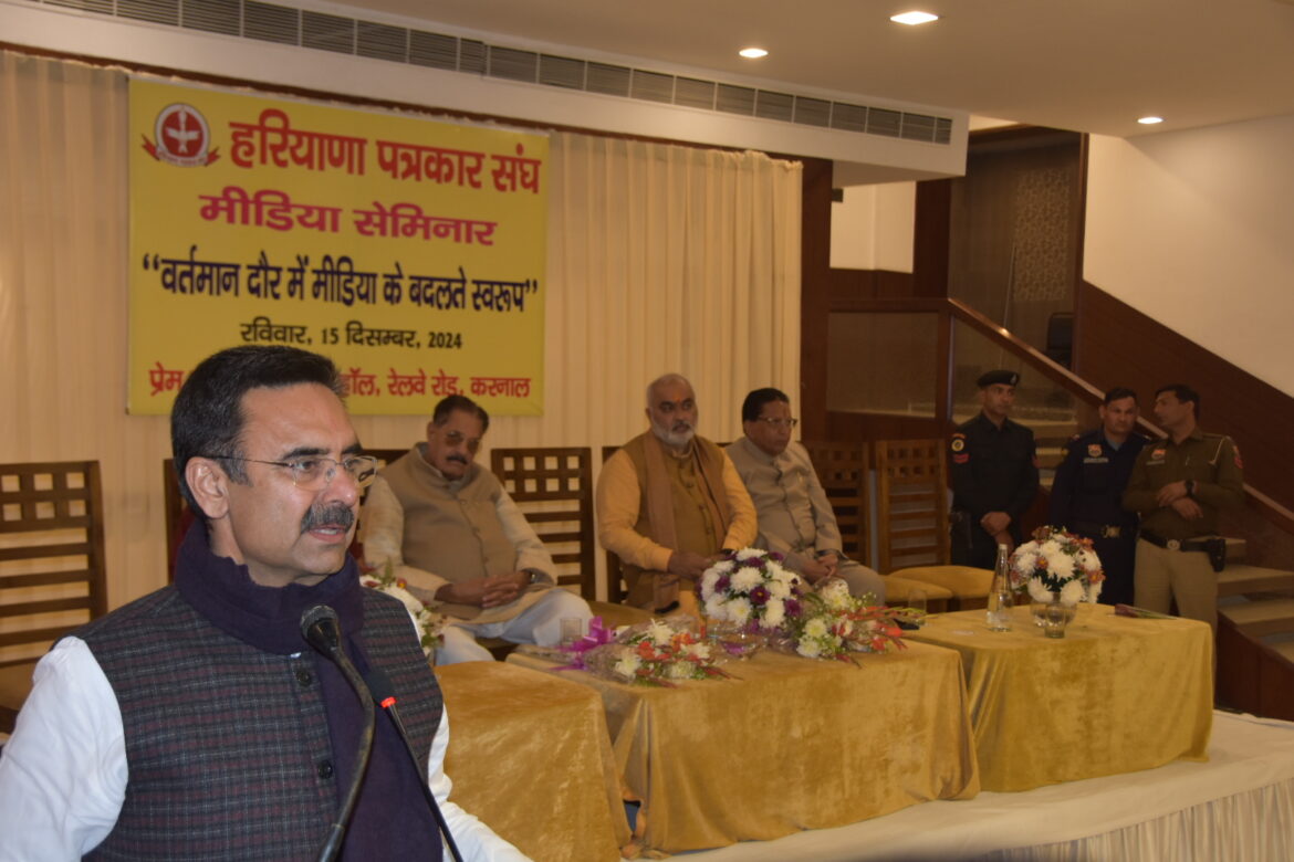 करनाल। हरियाणा विधानसभा अध्यक्ष हरविंद्र कल्याण ने कहा है कि राष्ट्र निर्माण में मीडिया की अहम भूमिका है। मीडिया न केवल लोगों को जागरूक करता है बल्कि उनकी समस्याओं को सरकार तक पहुंचाता भी है। श्री कल्याण आज यहां हरियाणा पत्रकार संघ द्वारा वर्तमान दौर में मीडिया का बदलता स्वरूप विषय पर आयोजित सेमिनार में बतौर मुख्य अतिथि बोल रहे थे। इस मौके पर विधायक जगमोहन आनंद, पूर्व मंत्री शशि पाल मेहता, पूर्व मेयर रेणु बाला गुप्ता भी मौजूद थे।