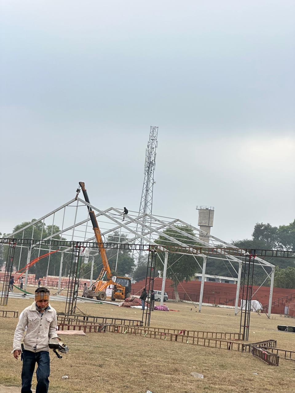स्टेडियम में वाटर प्रूफ बड़ा पंडाल भी लगाया जा रहा है