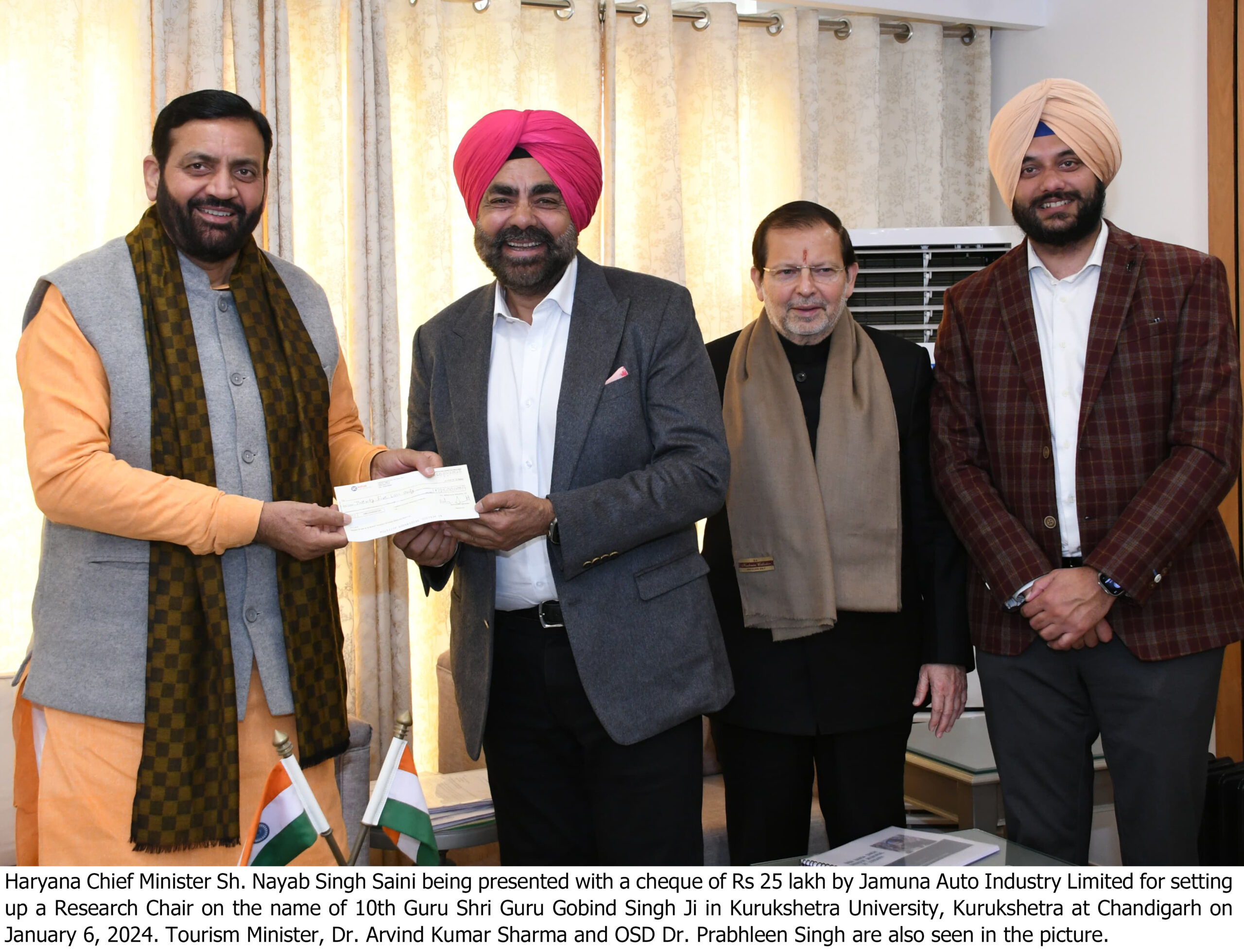 चंडीगढ़ । कुरुक्षेत्र विश्वविद्यालय, कुरुक्षेत्र में दसवें गुरु श्री गुरु गोबिंद सिंह जी के नाम पर शोध पीठ की स्थापना की जाएगी। जमुना ऑटो इंडस्ट्री लिमिटेड ने आज इस उद्देश्य के लिए हरियाणा के मुख्यमंत्री श्री नायब सिंह सैनी को 25 लाख रुपये का चेक भेंट किया।