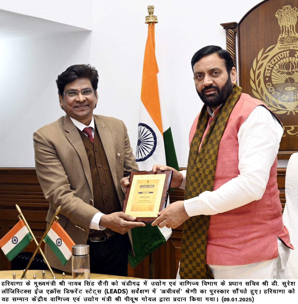 हरियाणा के मुख्यमंत्री नायब सिंह सैनी को उद्योग एवं वाणिज्य विभाग के प्रधान सचिव डी. सुरेश ने यह प्रतिष्ठित सम्मान प्रदान किया। हाल ही में केंद्रीय वाणिज्य एवं उद्योग मंत्री पीयूष गोयल द्वारा हरियाणा प्रदेश की उल्लेखनीय उपलब्धियों को मान्यता देते हुए नई दिल्ली में यह सम्मान प्रदान किया गया था।