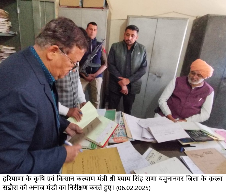 चंडीगढ़ । हरियाणा के कृषि एवं किसान कल्याण मंत्री श्याम सिंह राणा ने ड्यूटी में लापरवाही बरतने पर हरियाणा राज्य कृषि विपणन बोर्ड के चार अधिकारियों को निलंबित करने के आदेश दिए। यह कार्रवाई मंत्री द्वारा यमुनानगर जिला के क़स्बा सढौरा और रायपुर रानी की अनाज मंडियों के औचक निरीक्षण के दौरान की गई।