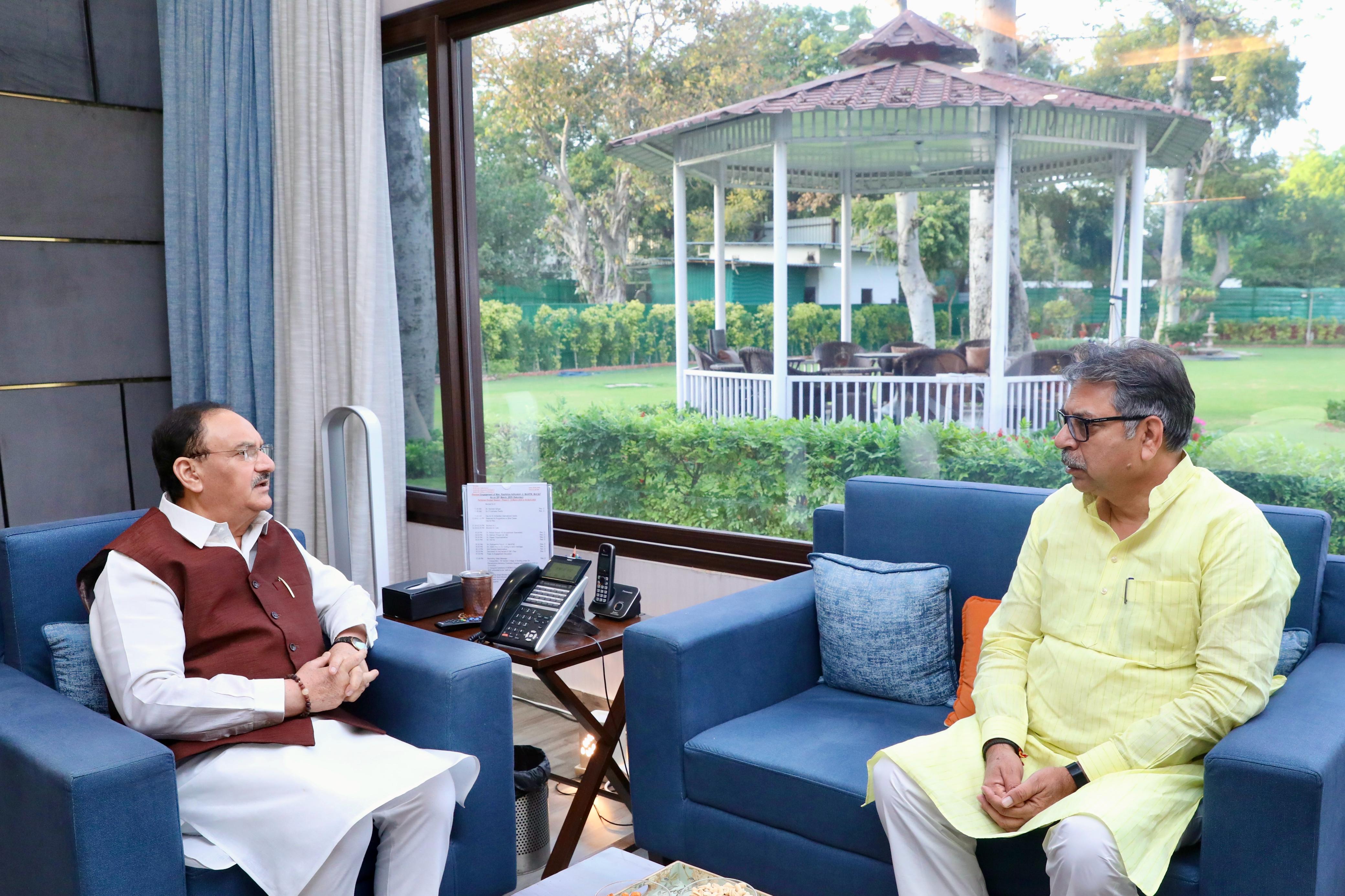 चंडीगढ़। नई दिल्ली प्रवास पर भाजपा राष्ट्रीय अध्यक्ष, कुशल संगठनकर्ता व केंद्रीय स्वास्थ्य मंत्री जेपी नड्डा से भाजपा हरियाणा प्रभारी, भाजपा राजस्थान पूर्व प्रदेशाध्यक्ष डॉ. सतीश पूनियां ने शिष्टाचार मुलाकात कर संगठनात्मक मार्गदर्शन लिया व राजस्थान-हरियाणा के विकास के मुद्दों व संगठन के विषयों पर पर सकारात्मक विस्तृत बातचीत हुई।