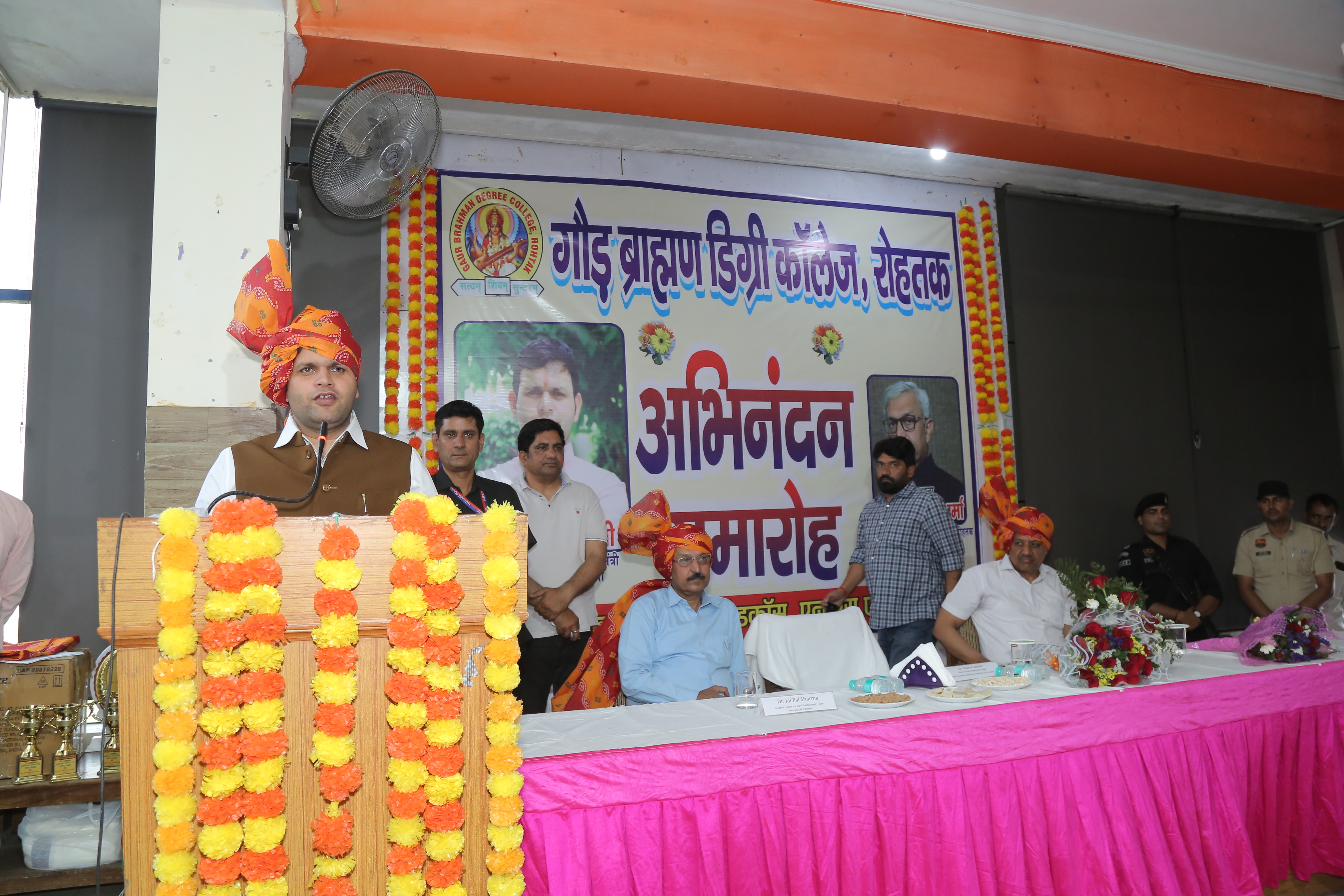 रोहतक । हरियाणा के खेल, युवा अधिकारिता एवं उद्यमिता व कानून विधायी राज्य मंत्री गौरव गौतम ने कहा कि हरियाणा की पहचान पहले एक कृषि प्रधान राज्य के रूप में होती थी, लेकिन अब यह खेलों का हब बन चुका है। यह बदलाव मुख्यमंत्री श्री नायब सिंह सैनी के नेतृत्व में प्रदेश में खेलों को बढ़ावा देने के लिए किए गए प्रयासों के कारण संभव हुआ है। मंत्री गौरव गौतम ने गौड़ ब्राह्मण डिग्री कॉलेज में अभिनंदन समारोह में बतौर मुख्यातिथि शिरकत की। कार्यक्रम में विशिष्ट अतिथि आईपीएस अधिकारी शिवचरण अत्री रहे। अध्यक्षता कॉलेज प्राचार्य एवं गौड़ ब्राह्मण शिक्षण संस्थाओं के पदेन सचिव डॉ जयपाल शर्मा ने की। उन्होंने सभी अतिथियों का स्वागत किया।
