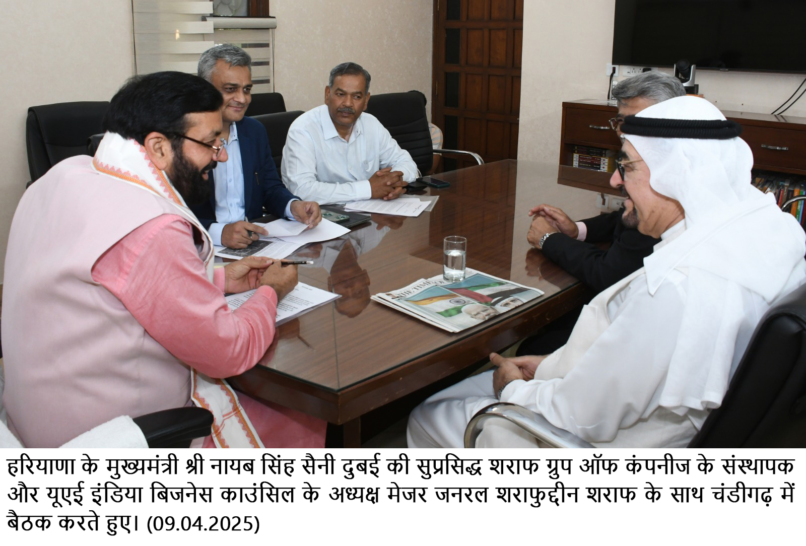 शराफ ग्रुप ऑफ कंपनीज के संस्थापक और यूएई-इंडिया बिजनेस काउंसिल के चेयरमैन मेजर जनरल शराफुद्दीन शराफ ने आज यहां संत कबीर कुटीर पर हरियाणा के मुख्यमंत्री श्री नायब सिंह सैनी से मुलाकात की और हरियाणा में अपनी कंपनी के विस्तार करने में गहरी रुचि जताई।