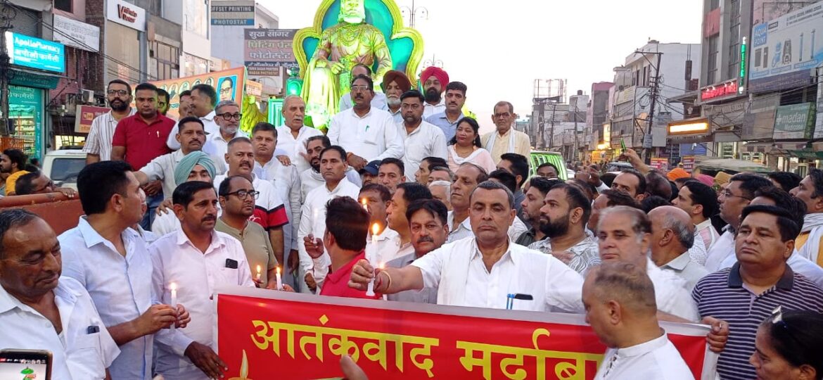 कुरुक्षेत्र। पहलगाम हत्याकांड के विरोध थानेसर के विधायक एवं पूर्व मंत्री अशोक अरोड़ा के नेतृत्व मे कांग्रेस कार्यकर्ताओं ने मृतकों की आत्मा की शांति के लिए कैंडल मार्च निकाला। इस कैंडल मार्च मे शाहाबाद विधायक रामकरण काला, पिहोवा विधायक मनदीप चट्ठा, पूर्व विधायक मेवा सिंह, इंपु्रवमैंट ट्रस्ट के पूर्व चेयरमैन जलेश शर्मा, नगर पार्षद मनू जैन, पार्षद परविंद्र सिंह पिं्रस, हिमांशु अरोड़ा, सुरेंद्र सैनी भिवानीखेडा, पूर्व पार्षद गौरव शर्मा गौरी, अमित गर्ग शैंकी, कांग्रेसी नेता सुनीता नेहरा, निशी गुप्ता, परवेश राणा, सुभाष पाली, मेहर सिंह रामगढ, जिला बार एसो. के पूर्व प्रधान गुरतेज सिंह शेखों, सुनील राणा, अशोक भट्ट, जयनारायण कौशिक, विवेक भारद्वाज, विशाल सहित बडी संख्या मे कार्यकर्ताओं ने भाग लिया। सभी कांग्रेस कार्यकर्ता कांग्रेस भवन पर इकट्ठा हुए और वहां से हाथों मे जलती हुई मोमबत्ती लेकर कैंडल मार्च निकालते हुए महाराज अग्रसेन चौक तक पहुंचे और मृतकों की आत्मा की शांति के लिए दो मिनट का मौन रखा। प्रदर्शनकारियों ने पाकिस्तान तथा आतंकवाद मुर्दाबाद के नारे लगाए।