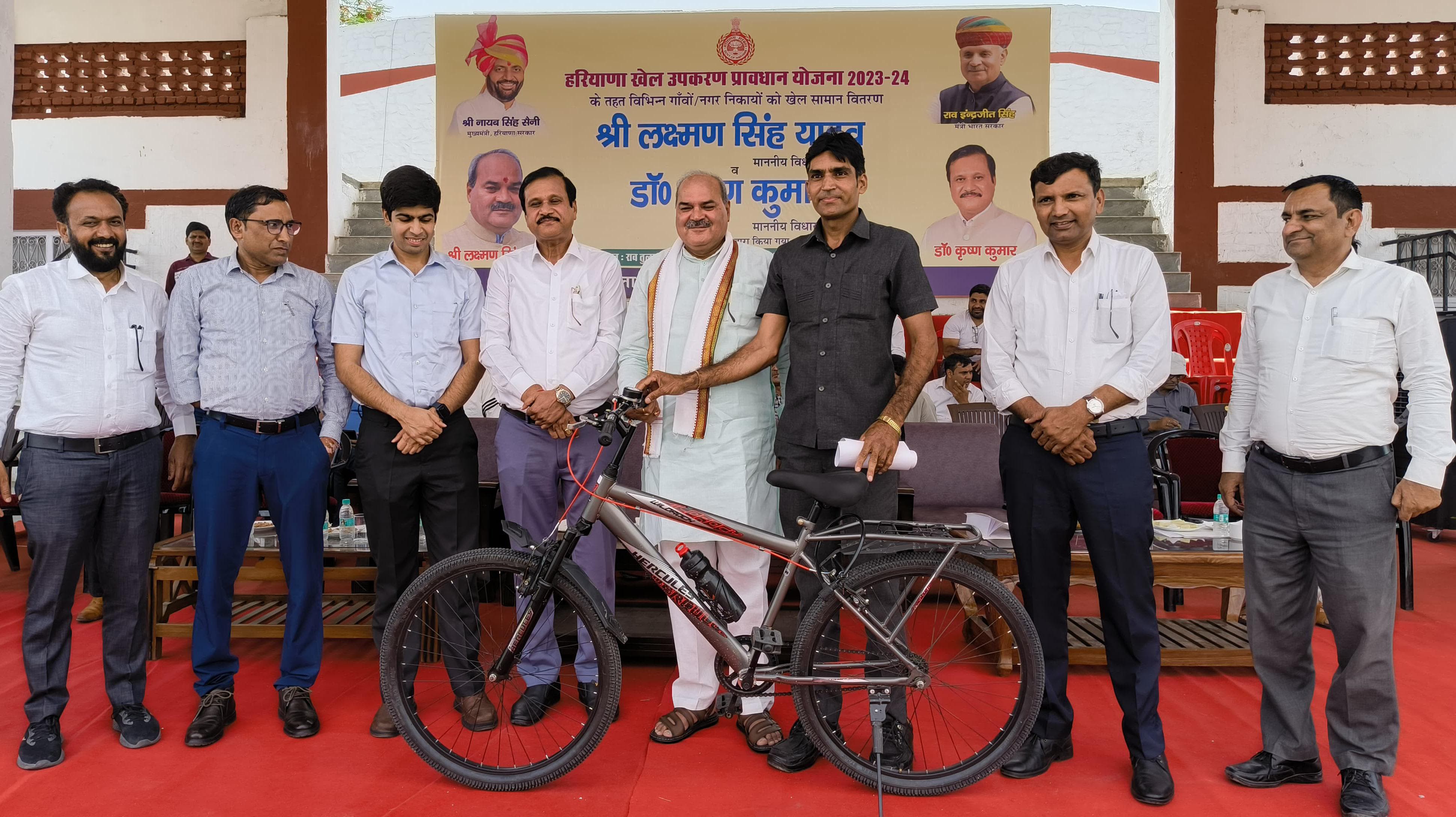 रेवाड़ी विधायक लक्ष्मण सिंह यादव, बावल विधायक डा. कृष्ण कुमार व डीसी अभिषेक मीणा ने किया खेल सामान का वितरण