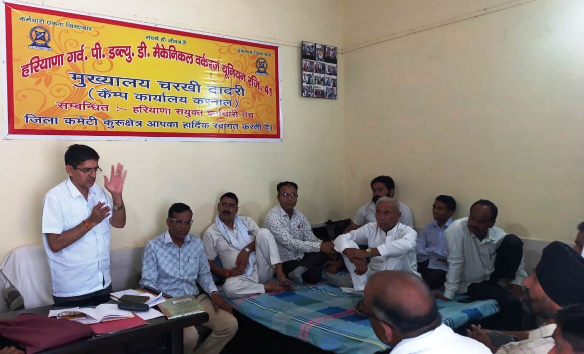 कुरुक्षेत्र। हरियाणा संयुक्त कर्मचारी मंच से संबंधित हरियाणा गवर्नमेंट पीडब्ल्यूडी मैकेनिकल वर्कर्स यूनियन रजिस्ट्रेशन नंबर 41 मुख्यालय चरखी दादरी कैंप कार्यालय करनाल की यूनियन कार्यालय बिरला मंदिर कुरुक्षेत्र में पदाधिकारियों की एक आवश्यक मीटिंग राज्य अध्यक्ष कुलवंत शर्मा की अध्यक्षता में संपन्न हुई। बैठक का संचालन ब्रांच सचिव कुलदीप सैनी ने किया। राज्य अध्यक्ष कुलवंत शर्मा ने बताया कि जन स्वास्थ्य विभाग का कार्यकारी अभियंता कुरुक्षेत्र हरियाणा सरकार द्वारा दी हुई सुविधाओं को लागू करने में आनाकानी कर रहे है। इसके कार्यालय में यूनियन के पदाधिकारी व कर्मचारी अपनी जायज मांगों के लिए इनसे व इनके उप अधीक्षक से मिलते हैं तो यह तानाशाही रवैया अपनाते हैं। यह अधिकारी सरकार की हिदायतों को न मानकर अपनी मर्जी के फरमान लागू कर रहे हैं। उन्होंने कहा कि संबंधित अधिकारी ने अपने दफ्तर में रिटायर्ड हुए कर्मचारियों को लगा रखा है। जबकि उनकी न तो सैंक्शन है और अपनी सुविधा अनुसार गलत कार्य को करवाने के लिए रखा हुआ है। संगठन बार-बार रिटायर हुए कर्मचारियों को हटाने के लिए कह चुका है परंतु यह अधिकारी तानाशाही रवैया अपने हुए हैं। जिस कारण एमपीडब्ल्यू कर्मचारियों को आज तक भी वेतन नहीं दिया गया है। कर्मचारियों के स्टाफ क्वार्टरों के टेंडर लगाए जाते हैं लेकिन रिपेयर के पैसे कहां जाते हैं। इसका कोई अता-पता नहीं है। जलघरों की दशा दयनीय है। कर्मचारियों के रोष को देखते हुए 16 मई को सुबह 10:00 से 12:00 तक गेट मीटिंग की जाएगी। जिसकी जिम्मेवारी कार्यकारी अभियंता की होगी। बैठक में राज्य चेयरमैन सत्यपाल वर्मा, जिला प्रधान अशोक यादव, जिला सचिव राम रतन शर्मा, ब्रांच चेयरमैन राजेश सैनी, रिखीराम यादव, इंद्रपाल सिंह, गुरनाम कश्यप, सतीश कुमार, वीरेंद्र सिंह, सुखबीर रोहिल्ला, मुनीत बारना, राधेश्याम शर्मा आदि ने अपने विचार रखे। साथ ही गेट मीटिंग में बढ़-चढ़कर भाग लेने का आवाहन किया।