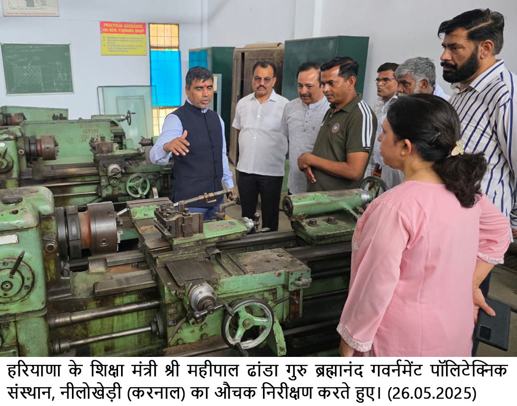 चंडीगढ़ । हरियाणा के शिक्षा मंत्री महीपाल ढांडा ने आज गुरु ब्रह्मानंद गवर्नमेंट पॉलिटेक्निक संस्थान, नीलोखेड़ी (करनाल) का औचक निरीक्षण किया। इस दौरान मंत्री ने संस्थान में शैक्षणिक गतिविधियों, विद्यार्थियों की उपस्थिति व व्यवस्थाओं का जायज़ा लिया। मंत्री ने स्टाफ व छात्रों से संवाद कर उनकी समस्याएं सुनी और उनके सुझाव भी लिए। इस मौके पर शिक्षा मंत्री महीपाल ढांडा ने कहा कि हरियाणा देश का अग्रणी राज्य है, जिसने राष्ट्रीय शिक्षा नीति-2020 को सफलतापूर्वक लागू किया है। उन्होंने कहा कि हरियाणा सरकार का संकल्प है कि युवाओं को बेहतर शिक्षा और प्रशिक्षण का माहौल उपलब्ध करवाना है, ताकि वे देश और प्रदेश का नाम रोशन करें।
