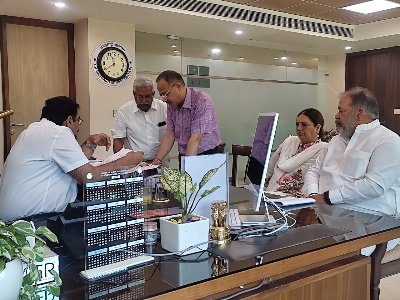 चंडीगढ़ । पूर्व भाजपा, चंडीगढ़ प्रदेशाध्यक्ष व वरिष्ठ नेता अरुण सूद के नेतृत्व में ऑल कांटरैकचुअल कर्मचारी संघ भारत, यूटी चंडीगढ़ के बैनर तले विभिन्न कर्मचारियों की समस्याओं के समाधान के लिए मुलाकात करने गए प्रतिनिधिमंडल ने अपनी समस्याएं चंडीगढ़ प्रशासन के चीफ सेक्रेटरी राजीव वर्मा के समक्ष रखीं।