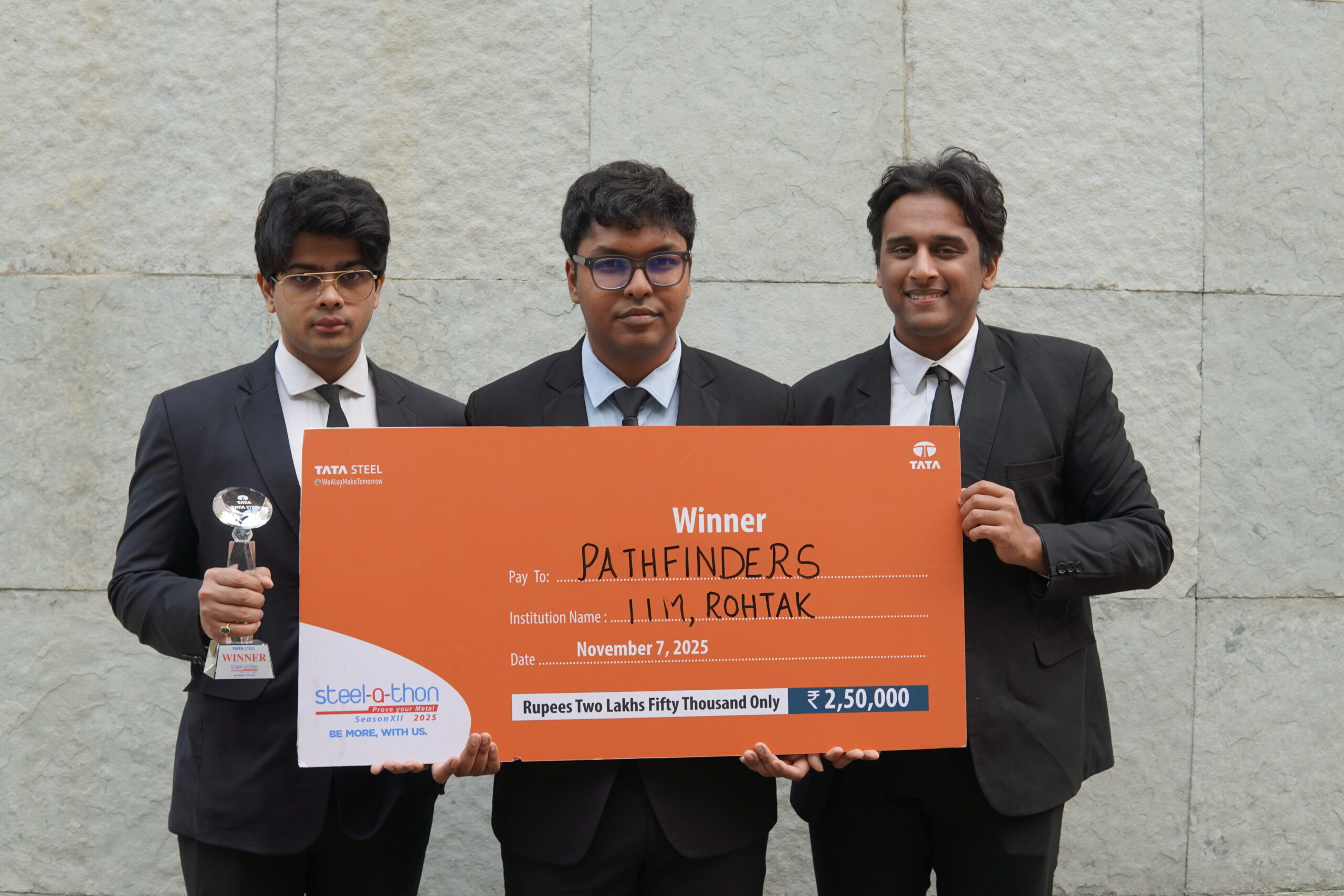 टीम के उत्कृष्ट प्रदर्शन के लिए उन्हें ग्रोथ ट्रैक में प्रथम स्थान तथा 2,50,000 रुपये की नकद पुरस्कार राशि प्रदान की गई। टाटा स्टील के वरिष्ठ अधिकारियों से बनी जूरी ने टीम की व्यापक और व्यावहारिक समस्या-समाधान दृष्टि की सराहना की और इस्पात उद्योग की प्रमुख चुनौतियों को संबोधित करने वाले उनके नवाचारी एवं लागू किए जा सकने वाले विचारों की विशेष प्रशंसा की। टाटा स्टील-ए-थॉन 2025 के विजेताओं को टाटा स्टील की ओर से प्री-प्लेसमेंट ऑफर (PPO) प्रदान किए गए, जबकि सभी राष्ट्रीय फाइनलिस्टों को विशेष साक्षात्कार अवसर दिए गए, जिससे देश के एक प्रतिष्ठित कॉर्पोरेट समूह के साथ करियर के आकर्षक अवसर खुले।