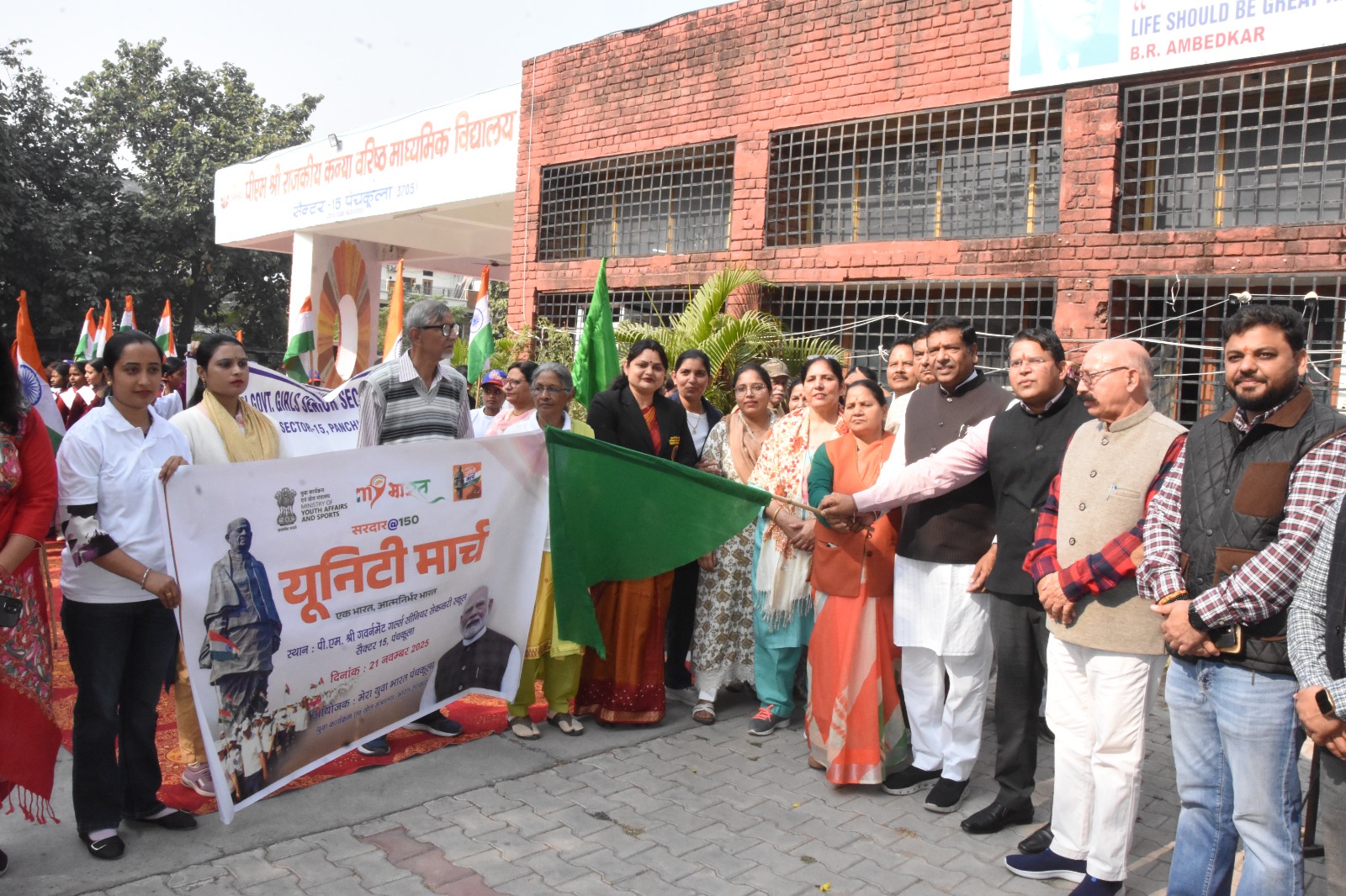 पंचकूला। एसडीएम चंद्रकांत कटारिया ने सरदार वल्लभ भाई पटेल की 150वीं जयंती के उपलक्ष्य में मेरा युवा भारत द्वारा आयोजित कार्यक्रम में पीएम श्री राजकीय माॅडल कन्या वरिष्ठ माध्यमिक विद्यालय सेक्टर-15 से जिला स्तरीय पद यात्रा को हरी झंडी दिखाकर रवाना किया।