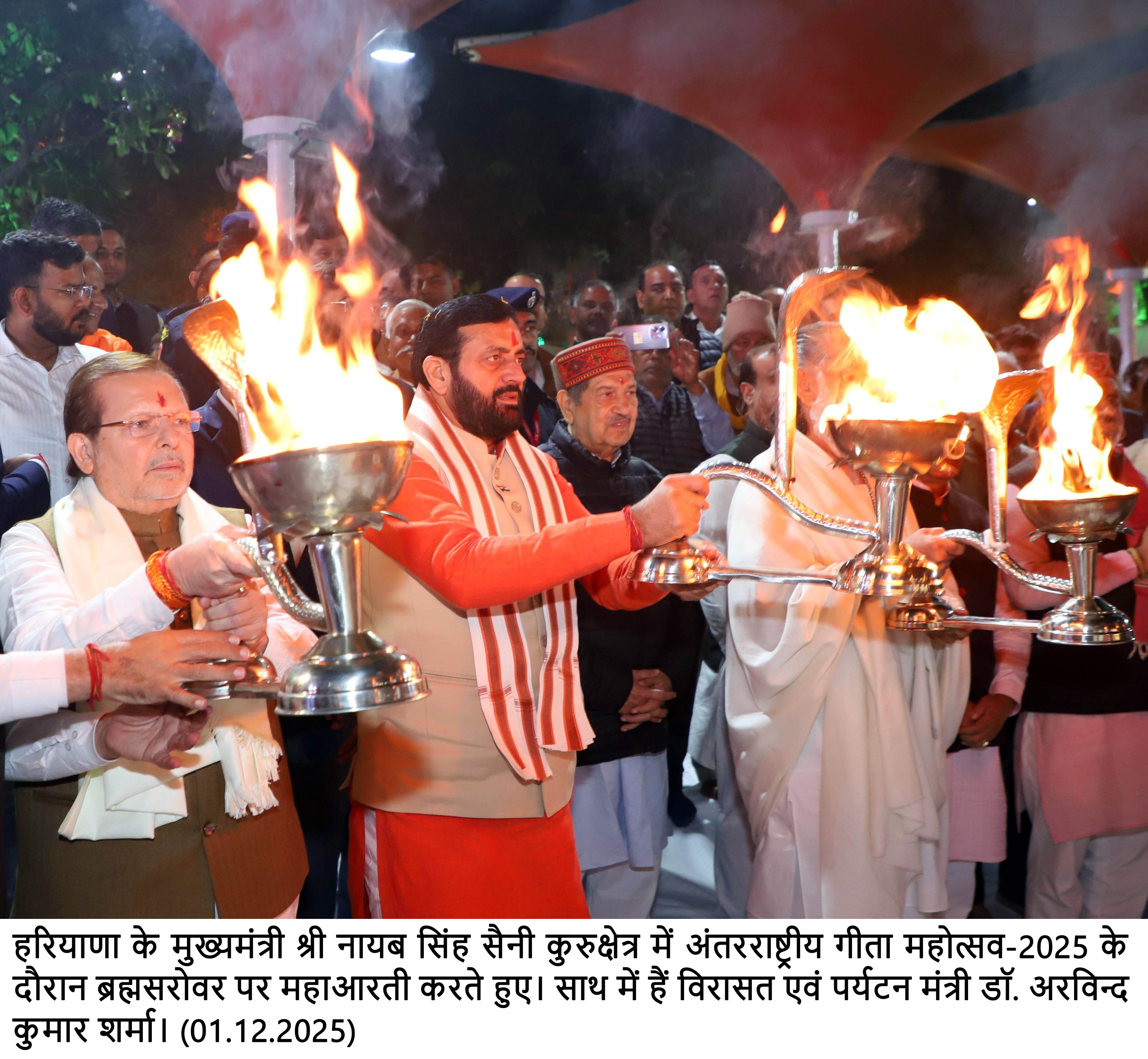 इससे पहले मुख्यमंत्री नायब सिंह सैनी, गीता मनीषी स्वामी ज्ञानानंद जी महाराज, पर्यटन मंत्री डा. अरविंद शर्मा, पूर्व राज्यमंत्री सुभाष सुधा ने गीता जयंती के पावन पर्व पर मंत्रोच्चारण और शंखनाद की ध्वनि के बीच सन्निहित सरोवर में दीपदान किया।