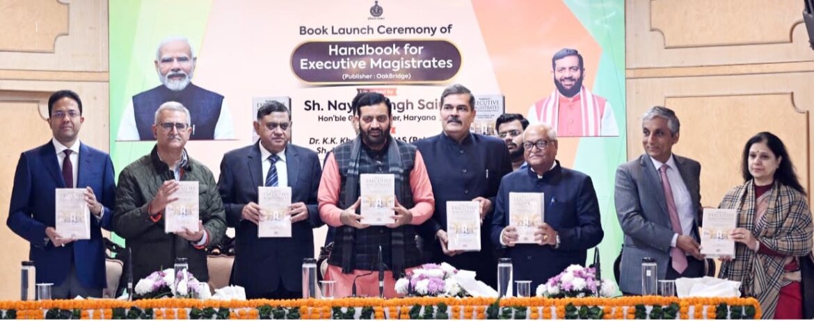 चंडीगढ़। हरियाणा के मुख्यमंत्री नायब सिंह सैनी ने मंगलवार को ‘हैंडबुक फॉर एग्जीक्यूटिव मजिस्ट्रेट्स’ का विमोचन किया। यह पुस्तक वरिष्ठ आईएएस अधिकारी (सेवानिवृत्त) डॉ. के.के. खंडेलवाल और हरियाणा सरकार में अतिरिक्त मुख्य सचिव श्री अपूर्व कुमार सिंह द्वारा लिखी गई है।