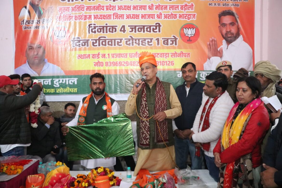 चंडीगढ़। भाजपा प्रदेश अध्यक्ष पंडित मोहन लाल बड़ौली ने रविवार को वार्ड नंबर 1, प्रजापति धर्मशाला जटवाड़ा सोनीपत में आयोजित कार्यक्रम के दौरान महेश प्रजापति की अगुवाई में कांग्रेस छोड़कर आए सैकड़ों लोगों को भाजपा में शामिल किया। उन्होंने सभी कार्यकर्ताओं को पार्टी का पटका पहनाकर उनका स्वागत किया और पार्टी में पूरा मान और सम्मान देने की बात कही। वहीं भाजपा में शामिल हुए सभी लोगों ने श्री बड़ौली को आश्वासन देते हुए कहा कि वे सभी मिलकर राष्ट्र निर्माण में अपनी अहम भूमिका निभाएंगे तथा पार्टी को और अधिक मजबूत करने का काम करेंगे।भाजपा प्रदेश अध्यक्ष पंडित मोहन लाल बड़ौली ने कहा कि भाजपा कार्यकर्ताओं की पार्टी है और कार्यकर्ता ही संगठन की ताकत है। उन्होंने कहा कि हमारे कार्यकर्ता संगठन और जनता के बीच एक मजबूत पुल का काम करते हैं। भाजपा के कार्यकर्ता लोगों के सुख-दुख में उनके साथ खड़े रहते हैं जो सेवा और समर्पण का प्रतीक है।श्री बड़ौली ने कहा कि नायब सैनी सरकार का लक्ष्य सबका विकास है। भाजपा सभी वर्गों को साथ लेकर चलने वाली पार्टी है। हरियाणा में नायब सैनी सरकार बिना भेदभाव के प्रदेश का विकास कर रही है। उन्होने कहा कि मुख्यमंत्री नायब सिंह सैनी प्रदेश में लोककल्याण के संकल्प के साथ काम कर रहे हैं। उन्होंने कहा कि भाजपा सरकार में युवाओं को योग्यता के आधार पर नौकरियां मिल रही है। सरकार की योजनाओं का लाभ अंतिम व्यक्ति तक पहुंच रहा है। उन्होंने कहा कि आज हरियाणा में गरीबा लोगों को आष्युमान और चिरायु योजना के तहत निशुल्क इलाज हो रहा है।मोहन लाल बड़ौली ने कहा कि गरीब महिलाओं को 500 रुपये में गैस सिलेंडर मिल रहा है। उन्होंने कहा कि नायब सैनी सरकार लाड़ो लक्ष्मी योजना के तहत महिलाओं को हर महीने 2100 रुपये दे रही है। श्री बड़ौली ने कहा कि सरकार की ऐसी तमाम गरीब कल्याण की योजनाएं हैं जिनका लाभ हर पात्र नागरिक को मिल रहा है।बीजेपी प्रदेश अध्यक्ष बड़ौली ने कहा कि नायब सैनी सरकार सबका साथ, सबका विकास, सबका प्रयास और सबका विश्वास के मूलमंत्र पर चलते हुए हरियाण को विकसित राज्य बनाने पथ पर अग्रसर है। उन्होंने सभी कार्यकर्ताओं का आह्वान करते हुए कहा कि भाजपा सरकार की नीतियों और योजनाओं को जन-जन तक पहुंचाएं। इस मौके पर विधायक पवन खरखौदा, जिला महामंत्री तरूण देवीदास, प्रदेश प्रवक्ता राज कुमार कटारिया, जिला मीडिया प्रभारी दिनेश अत्री, आरती शर्मा, महेश कुमार, ललित बत्रा, हरि प्रकाश सैनी सहित पार्टी पदाधिकारी और सैकड़ों गणमान्य लोग उपस्थित रहे।