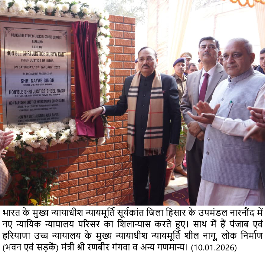 न्यायाधीश न्यायमूर्ति सूर्यकांत ने कहा कि नई अदालतों की स्थापना का मूल उद्देश्य एक्सेस टू जस्टिस यानी आम नागरिक तक न्याय को सरल, सुलभ और सस्ता बनाना है। उन्होंने हरियाणा सरकार को बधाई देते हुए कहा कि बरवाला और नारनौंद में सोमवार से न्यायिक कार्य प्रारंभ हो जाएगा। उन्होंने कहा कि संविधान निर्माताओं ने प्रत्येक राज्य में हाईकोर्ट की व्यवस्था इसी सोच के साथ की थी कि नागरिकों को अपने मौलिक, नागरिक व मानवाधिकारों के लिए दिल्ली तक न जाना पड़े, बल्कि वे अपने ही राज्य में न्याय प्राप्त कर सकें।न्यायमूर्ति सूर्यकांत ने हरियाणा सरकार का आभार जताते हुए कहा कि राज्य सरकार ने न्यायिक अवसंरचना के विकास में सदैव सहयोग किया है। उन्होंने बताया कि अपने कार्यकाल के दौरान वे हाईकोर्ट की बिल्डिंग कमेटी के चेयरमैन भी रहे और हरियाणा में कई न्यायिक परिसरों के निर्माण में सरकार से समय पर आर्थिक सहायता मिली। उन्होंने विश्वास व्यक्त किया कि पंजाब एवं हरियाणा हाईकोर्ट के मार्गदर्शन में न्यायिक अधिकारी आम आदमी के कष्टों को समझते हुए न्याय प्रदान करेंगे और गुणवत्ता पूर्ण न्याय देने में प्रदेश देश में अग्रणी बनेगा। ‘न्याय आपके द्वार’ की अवधारणा पर चलते हुए आमजन के पास न्यायिक परिसरों का निर्माण किया जा रहा है जोकि गरीब व्यक्तियों के लिए न्याय प्राप्त करने में काफी कारगर साबित हो रहे है। जहां निरंतर आधारभूत संरचना का विकास हो रहा है वहीं आमजन को गुणवत्तापूर्वक न्याय भी मिलना चाहिए।कैबिनेट मंत्री रणबीर सिंह गंगवा ने मुख्य न्यायाधीश न्यायमूर्ति सूर्यकांत का अपनी पैतृक धरती पर आगमन पर स्वागत करते हुए कहा कि आज का दिन हिसार जिला के लिए गौरव का दिन है। अपनी न्यायिक सूझबूझ से न्यायमूर्ति सूर्यकांत ने हरियाणा के साथ-साथ देश का मान बढ़ाया है। आज वे न्यायिक प्रक्रिया में सर्वोच्च शिखर पर पहुंचे है जोकि युवाओं के लिए प्रेरणादायक है। प्रदेश सरकार न्याय ढांचे को मजबूत करने के लिए प्रतिबद्ध है। न्याय की चौखट आम जन तक पहुंच रही है, अब लोगों को न्याय के लिए दूर नहीं जाना पड़ेगा।