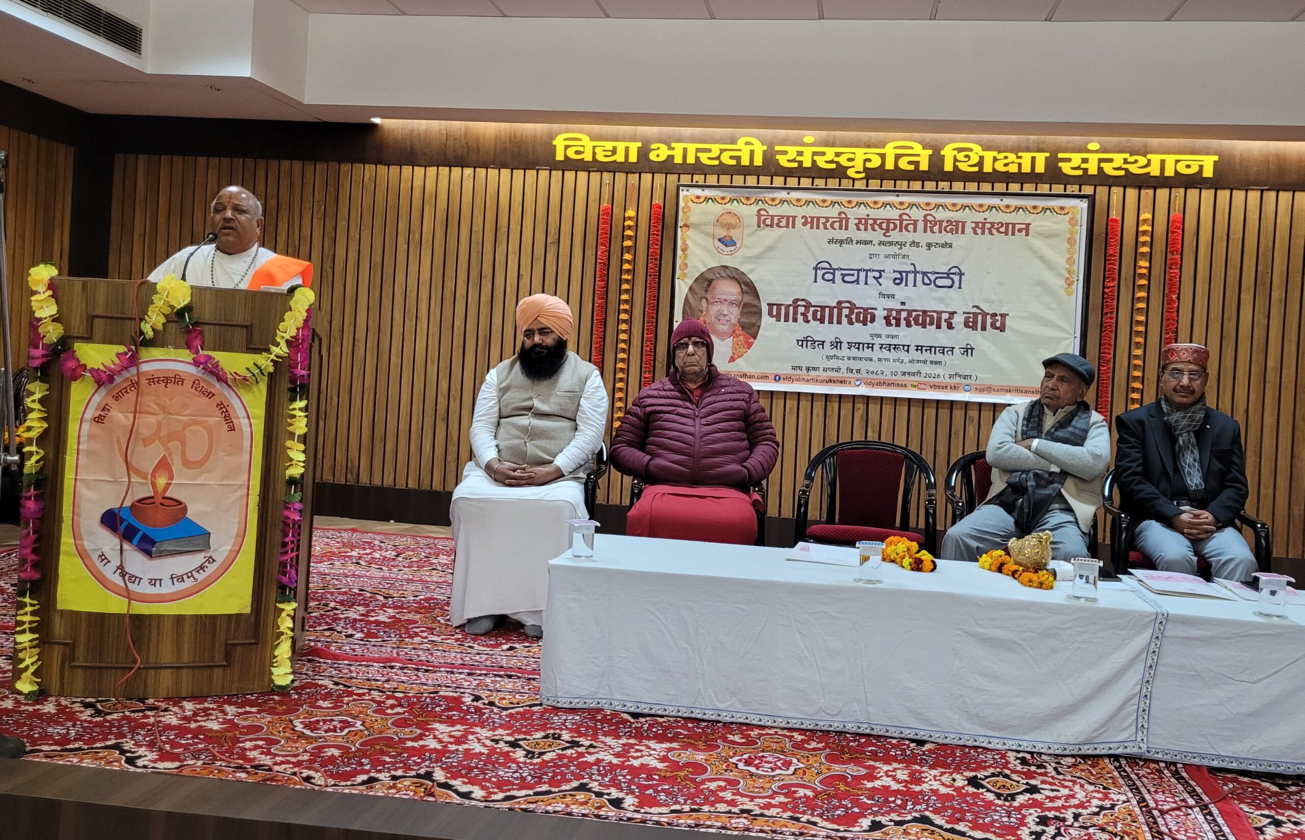 कुरुक्षेत्र। विद्या भारती संस्कृति शिक्षा संस्थान में पारिवारिक संस्कार बोध विषयक विचार गोष्ठी का आयोजन किया गया। गोष्ठी के मुख्य वक्ता सुप्रसिद्ध कथावाचक, मानस मर्मज्ञ एवं ओजस्वी वक्ता पंडित श्याम स्वरूप मनावत जी रहे। उनके साथ मंचासीन पंचायती अखाड़ा महानिर्वाणी से महंत बंसीपुरी जी महाराज, बड़ा उदासीन अखाड़ा कुरुक्षेत्र से महंत महेश मुनि जी महाराज, विद्या भारती हरियाणा से प्रांत संरक्षक श्री सत्यनारायण गुप्ता एवं विद्या भारती संस्कृति शिक्षा संस्थान के कोषाध्यक्ष श्री वीरेंद्र वालिया रहे। मंच संचालन श्री बलबीर ने किया जबकि अतिथि परिचय, स्वागत एवं गोष्ठी की प्रस्तावना विद्या भारती संस्कृति शिक्षा संस्थान के प्रबंधक श्री सुधीर कुमार ने रखी। गोष्ठी में आए हुए अतिथियों को फूलमालाओं, अंगवस्त्र एवं स्मृति चिन्ह प्रदान कर सम्मानित किया गया। इस अवसर पर मुख्य वक्ता पंडित श्याम स्वरूप मनावत ने कहा कि कोई भी कार्य तभी फलदायी, परिणामकारी और प्रसन्नतादायक होता है जब उसमें आपकी आत्म स्वीकृति होती है। जब तक आवश्यकता और आग्रह के लिए काम किया जाता है तब तक हम सेवक होते हैं और जब किसी काम को आत्म स्वीकृति से करते हैं तो स्वयंसेवक हो जाते हैं। इसीलिए आत्म स्वीकृति चाहिए ही चाहिए। उन्होंने तुलसीदास, मीरा और कबीरदास के अनेक उद्धरणों से इसे स्पष्ट किया। उन्होंने कहा कि विश्व कल्याण के लिए किसी न किसी परिवार को अपनी आहुतियां देने ही पड़ती हैं और विद्या भारती के काम में लगे कार्यकर्ताओं के परिवारों ने बहुत बड़ी आहुतियां दी हैं। उन्होंने विद्या भारती के काम में लगे कार्यकर्ताओं का उत्साहवर्द्धन करते हुए कहा कि अपना आत्म गौरव जागृत रखना कि हमारा परिवार अगर विद्या भारती के काम में लगा है और यह परिवार ही हमारा परिवार है तो हम शिक्षा के बहुत बड़े यज्ञ से जुड़े हुए लोग हैं। उन्होंने कहा कि घर दीवारों का नाम नहीं अपितु घर तो भावनाओं, संवेदनाओं, प्रेम और एक दूसरे के लिए जीने का नाम है। इसलिए हम उन घरों में रहते हैं जिन्हें परिवार कहते हैं। जहां परिवार के प्रति समर्पण है ,वहीं पारिवारिक संस्कार बोध आता है। पंडित श्याम स्वरूप ने कहा कि संस्कृति पशुओं की नहीं हो सकती। संस्कृति मनुष्यों की होती है। हमने जो कल्याणकारी प्रकृति बनाने का काम किया है उसी को संस्कृति कहते हैं और उसी के लिए ज्ञान यज्ञ की निरंतर आवश्यकता रहती है कि हम अपनी प्रकृति को औरों के लिए कैसे उपयोगी बना सकते हैं। हम अपनी प्रकृति को कैसे संस्कृति कर सकते हैं। इस अवसर पर महंत बंसीपुरी महाराज ने कहा कि आज हम अपनी वैदिक सनातन परंपराओं से भटकते जा रहे हैं। अगर हम आप एक सूत्र में बंधना चाहते हैं तो हमें अपने परंपराओं का अनु