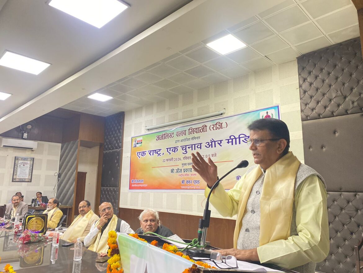 भिवानी में जर्नलिस्ट क्लब भिवानी द्वारा आयोजित एक राष्ट्र, एक चुनाव और मीडिया विषय पर आयोजित संगोष्ठी में बतौर मुख्य वक्ता पहुंचे भाजपा राष्ट्रीय सचिव औमप्रकाश धनखड़
